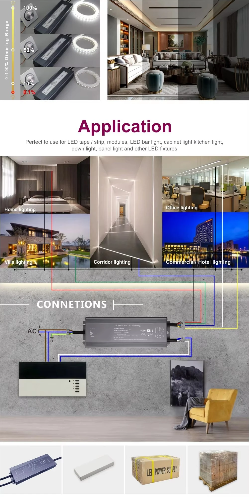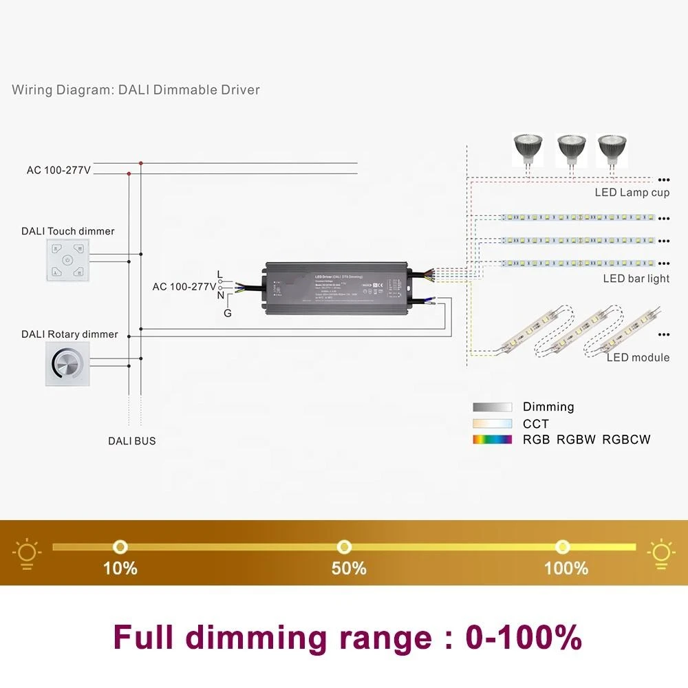 Starwell, produsen driver LED profesional ing China, Driver LED Dimming CCT Tegangan Konstan 100W DALI iki disertifikasi DALI-2, nawakake peredupan digital sing tepat saka 0.1% nganti 100% kanggo kontrol cahya sing mulus. Iki kalebu proteksi penting marang sirkuit cendhak, kakehan, lan over-suhu, kanthi pendinginan pasif liwat konveksi udara gratis.