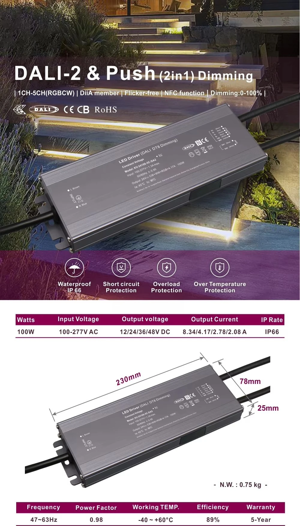 Pilih Driver 100W DALI-2 kita kanggo dhasar sing bisa dideleng ing mangsa ngarep sing nggabungake kontrol cerdas, proteksi sing kuat, lan daya serbaguna ing siji unit sing kompak lan dipercaya.