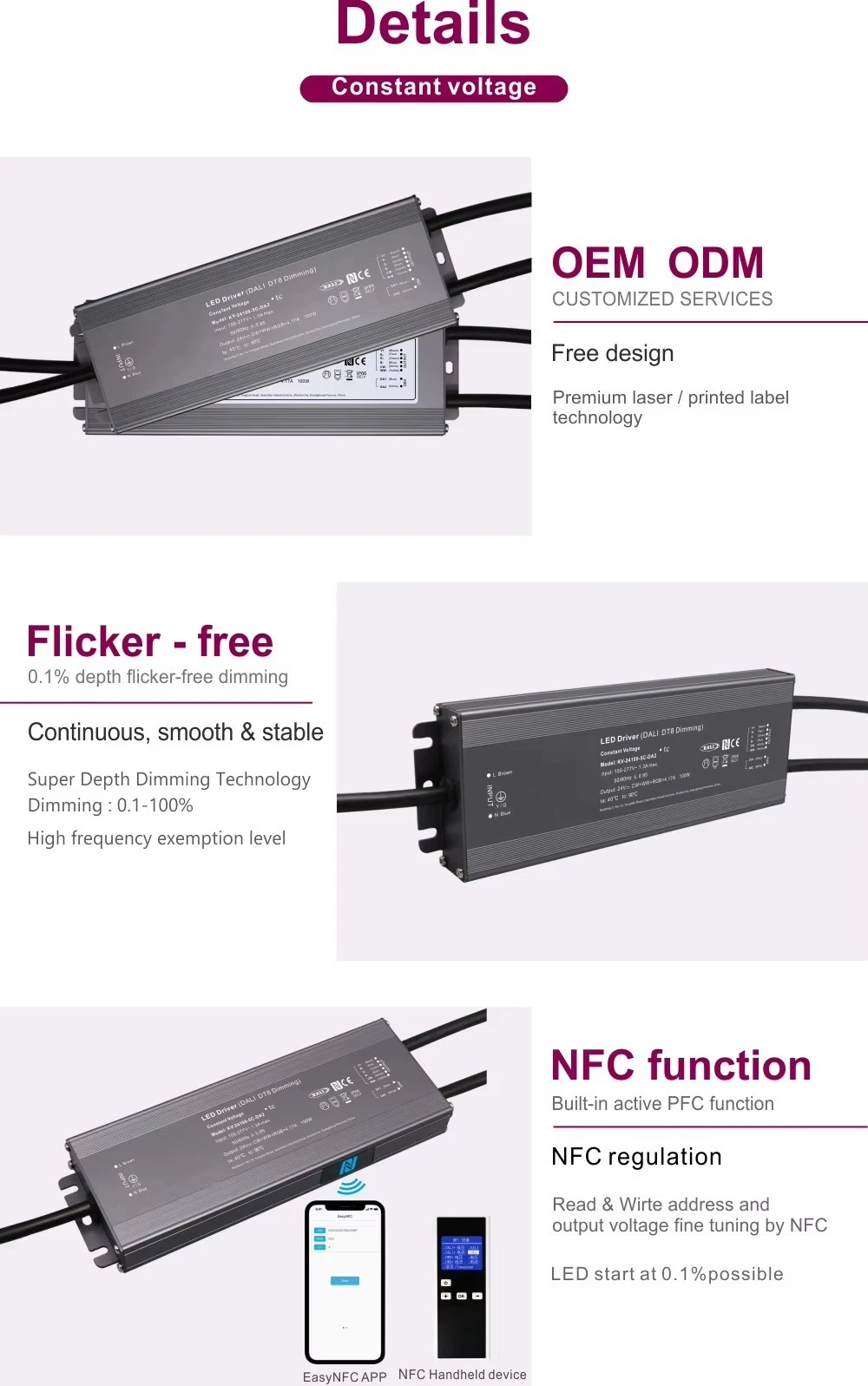 Kontrol Digital Lanjut karo DALI-2 Ing ngarep intelijen cahya, driver iki disertifikasi DALI-2, njamin interoperabilitas lengkap karo sistem kontrol DALI standar. Nyedhiyakake peredupan digital sing luar biasa lancar lan tepat ing sawetara ekstensif saka 0,1% nganti 100%, mbisakake nyiptakake swasana sing sampurna, pemandangan cahya sing dinamis, lan penghematan energi sing signifikan liwat manajemen cahya. Dimming ora kedhep, nambah kenyamanan visual.