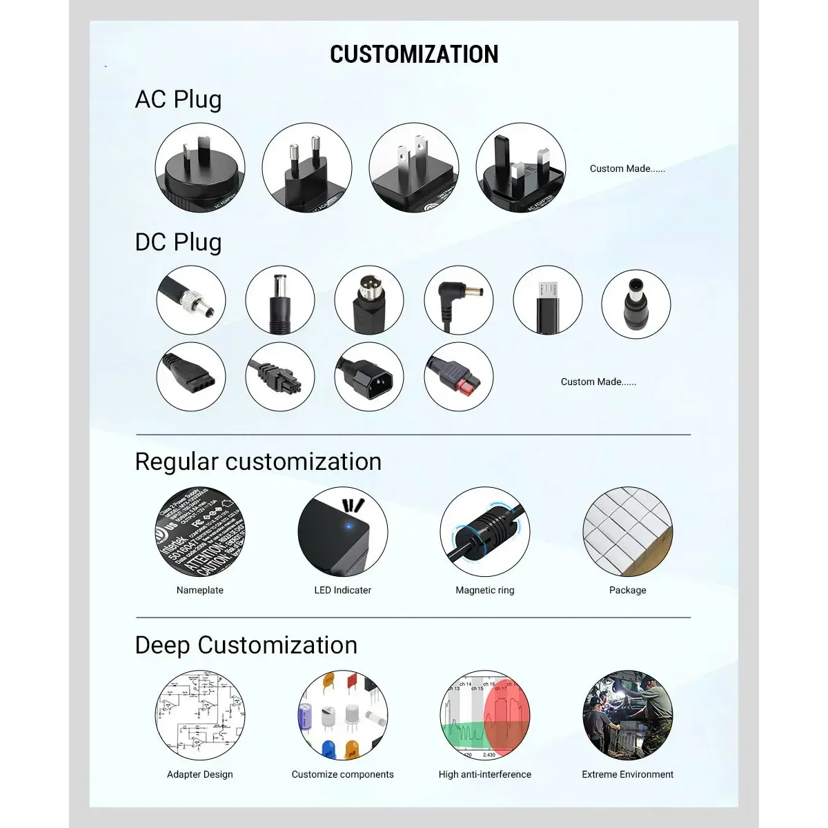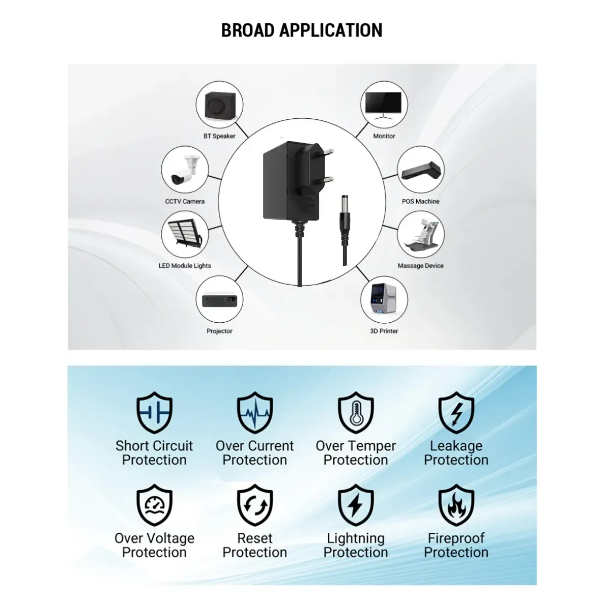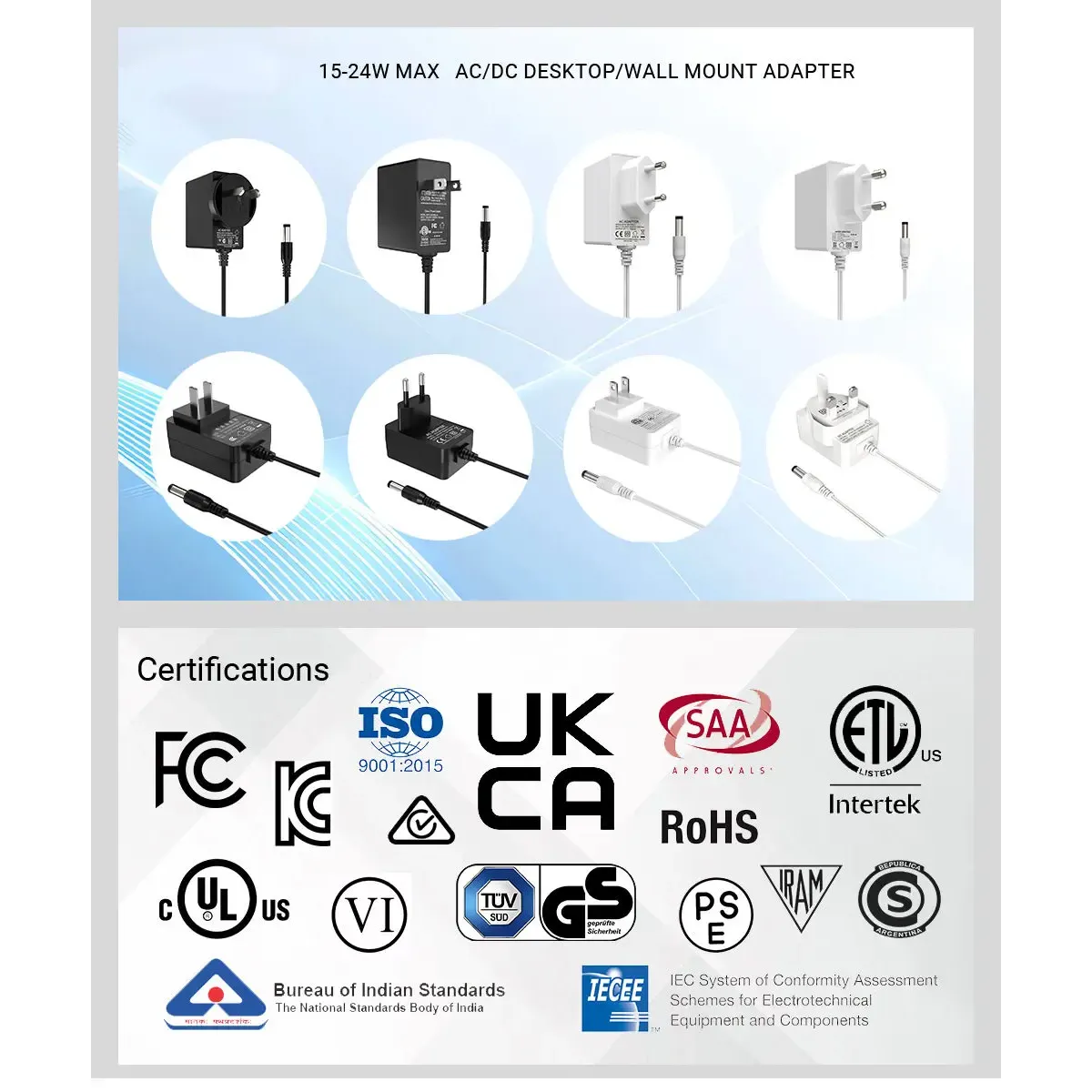 Seri Adaptor Daya 24Wen bisa ketemu standar internasional sing mandheg lan sertifikasi sertifikasi global, kalebu CE / FCC / SAA / SAA / SAA / SAA / SAA / SAA / SAA / SAA / SAA / SAA / SAA / SAA / SAA / PSE sertifikat, njamin kepinteran keamanan lan lingkungan. Desain plug Eropa ngidini sambungan aman, supaya gampang digunakake ing macem-macem setelan.