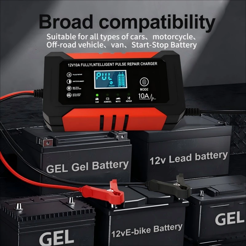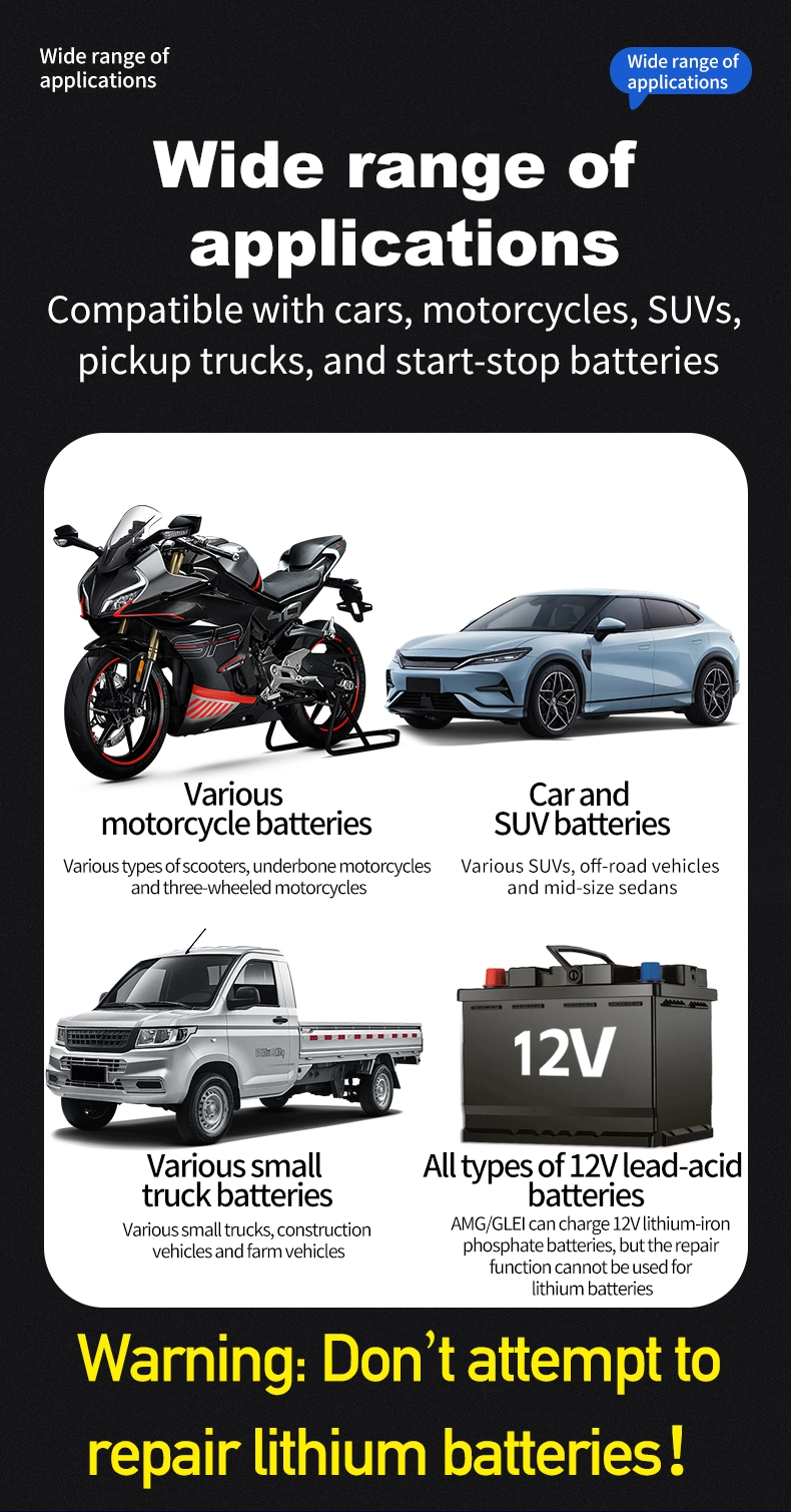 1. Kompatibilitas Universal & Dhukungan Multi-Baterei: Bisa dianggo kanthi lancar karo kabeh jinis baterei 12V, kalebu asam timbal, AGM, Gel, lan LiFePO4, sing nutupi kapasitas baterei saka 6Ah nganti 180Ah. Kisaran input sudhut 110~230V ngilangi watesan regional, saengga bisa digunakake ing luwih saka 100 negara lan wilayah ing saindenging jagad.