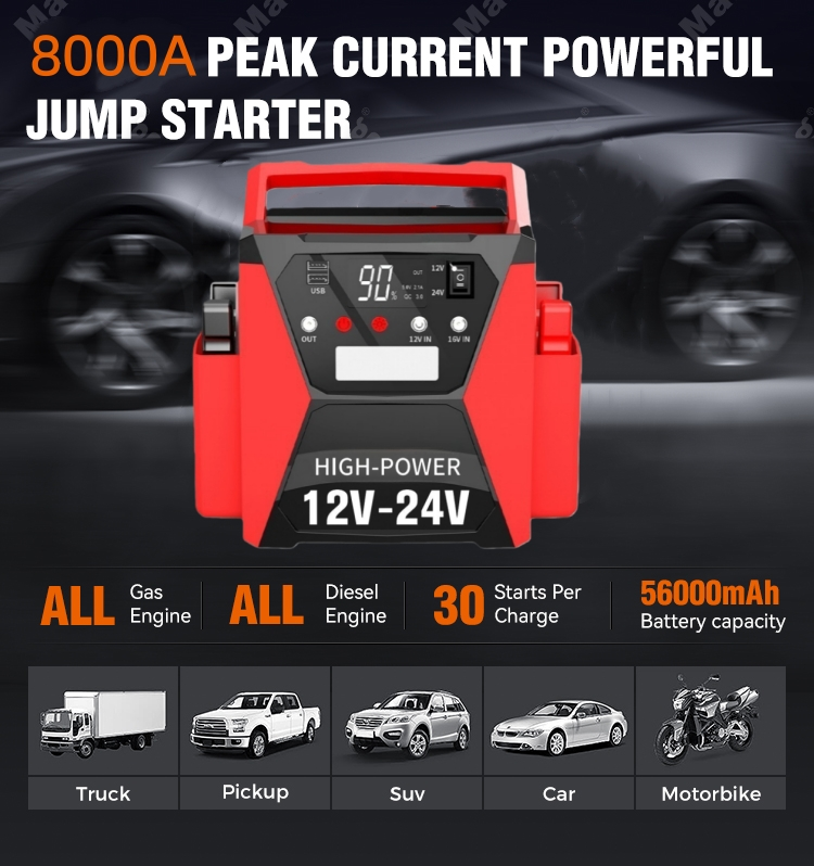 STARWELL ngenalake 12V / 24V Car Jump Starter Intelligent Battery Charger, game-changer kanggo pamilik kendharaan sing pengin linuwih lan intelijen ing pangopènan baterei lan wiwitan darurat. Dilengkapi arus puncak 8000A lan arus wiwitan 4000A, pangisi daya baterei cerdas dual-voltase iki nggabungake daya sing kuat karo teknologi cerdas, saengga cocog kanggo kabeh mesin gas lan mesin diesel nganti 15L, nutupi mobil, truk, RV, motor, prau, lan malah kendaraan komersial tugas abot.