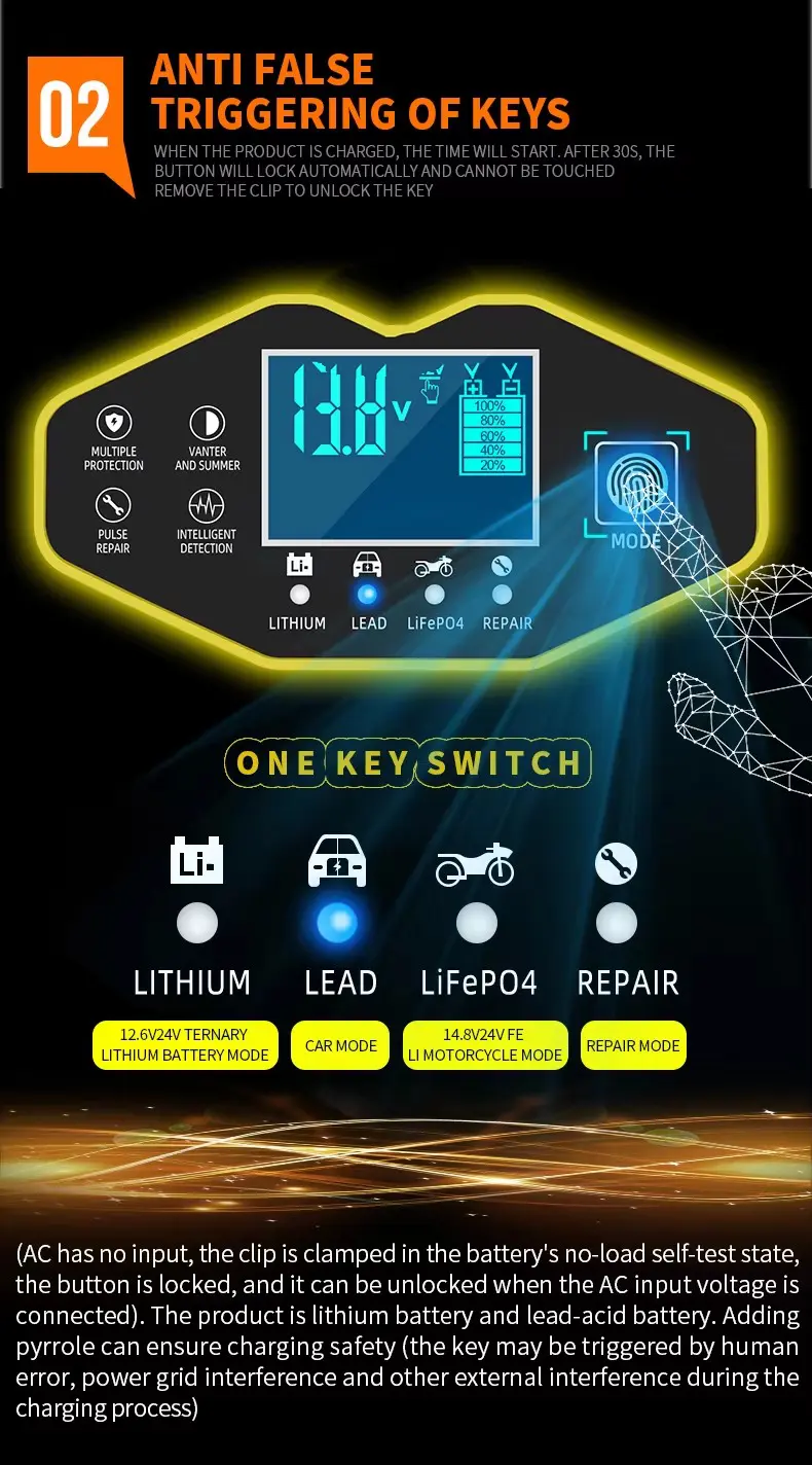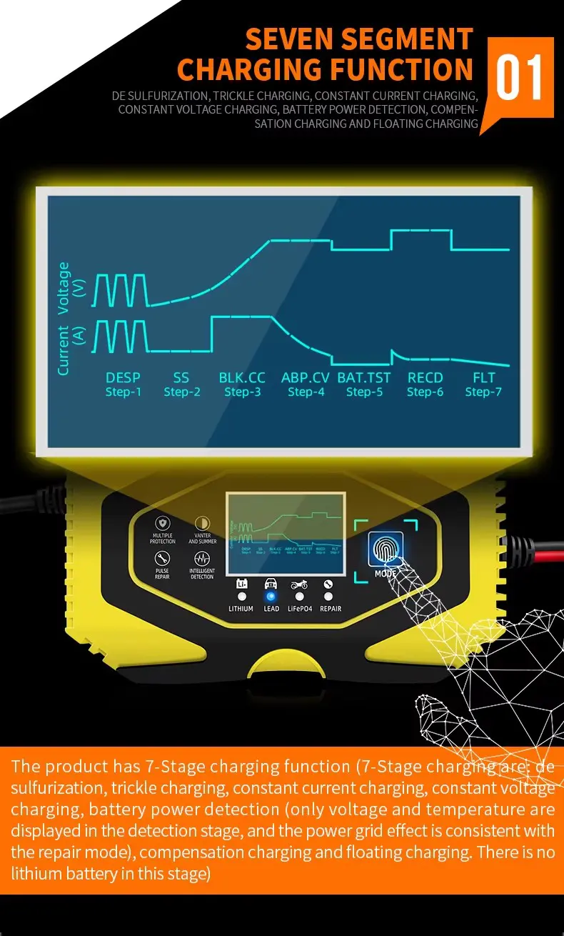 Pangisi daya 7-tataran cocog kanggo umume jinis baterei kalebu Kalsium, Gel AGM, Basah, Lithium. Asam timbal. baterei LifePo4. Padha uga bisa mbantu mulihake baterei sing kelangan lan sulphated.