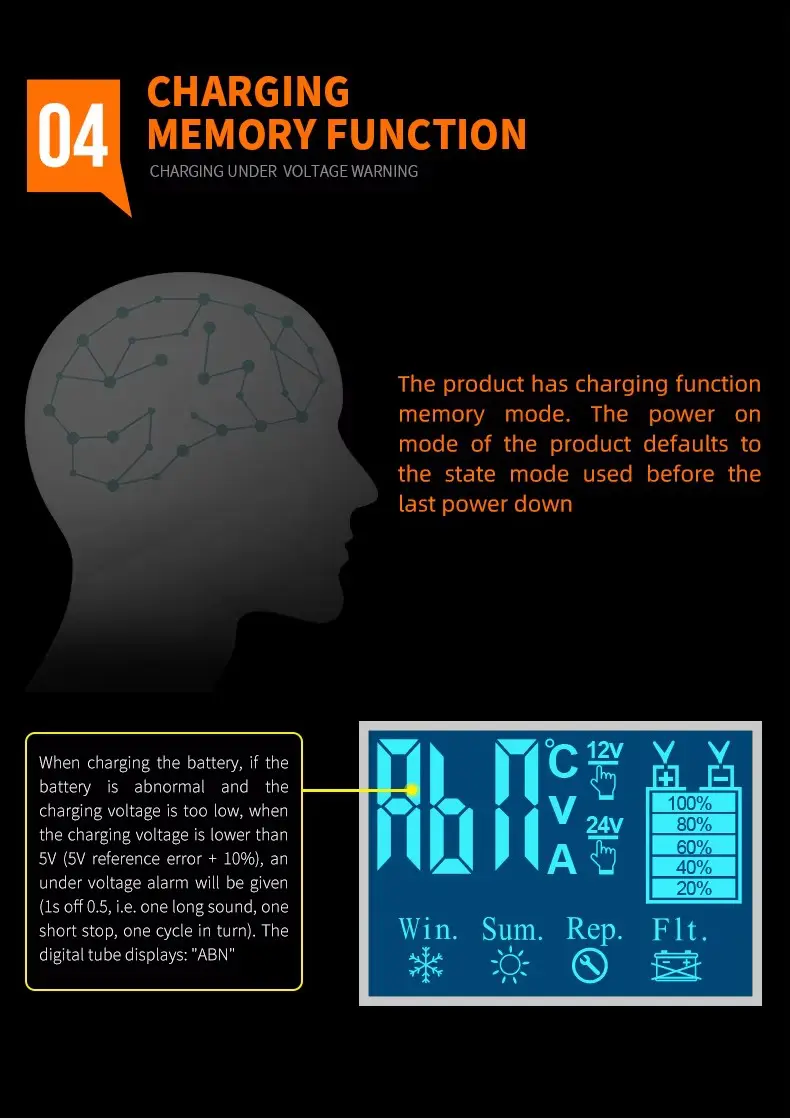 Fungsi tambahan kalebu ndandani baterei, rekondisi daya, lan ganti rugi suhu otomatis. Proteksi safety sing dibangun kalebu polaritas mbalikke, sirkuit cendhak, overcurrent, lan overheating, nyedhiyakake katentreman atine kanggo pangguna pamula lan pengalaman.
