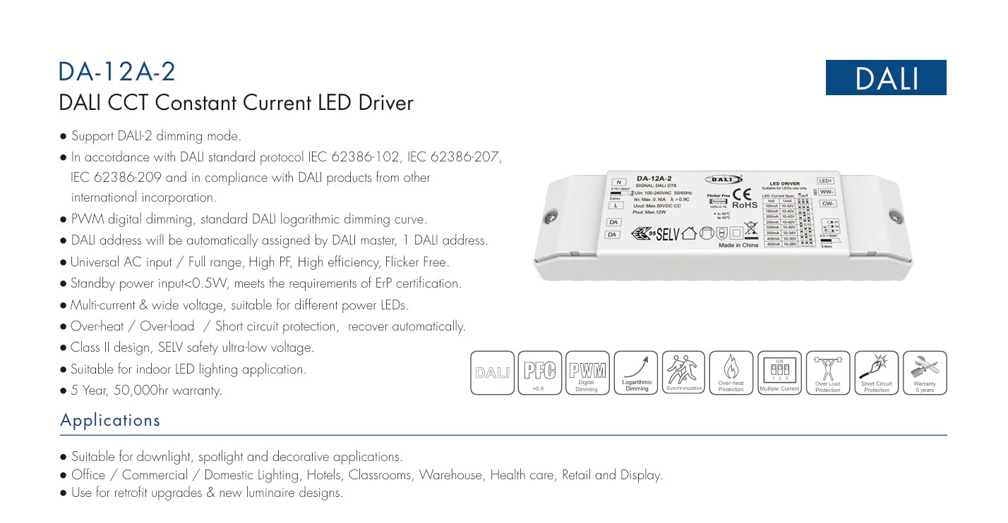Driver LED DALI CCT Dimmable Arus Konstan iki nduweni antarmuka Dual DALI sing canggih lan ndhukung protokol DALI-2 DT8 standar. Mbisakake ora mung lancar 10% -100% dimming nanging uga imbuhan linear independen saka suhu werna (CCT) saka 2700K kanggo 6500K. Liwat sistem DALI sing digabungake, pangguna bisa program pemandangan cahya dinamis-saka Awan kelangan fokus kanggo putih anget kanggo istirahat-nggawa keluwesan pokok lan kontrol cahya pinter kanggo dhuwur-mburi komersial lan aplikasi omah.