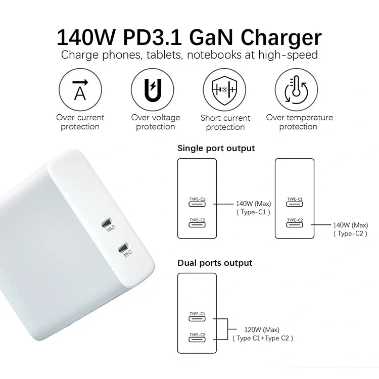 140W USB C Port Pd Pd Charger AS Plug Flatsle Kita: Port siji bisa nyedhiyani daya 140W. Daya output dual cerdas diawasi bebarengan. Nalika ngisi laptop lan ponsel ing wektu sing padha, efisiensi tetep ora owah.