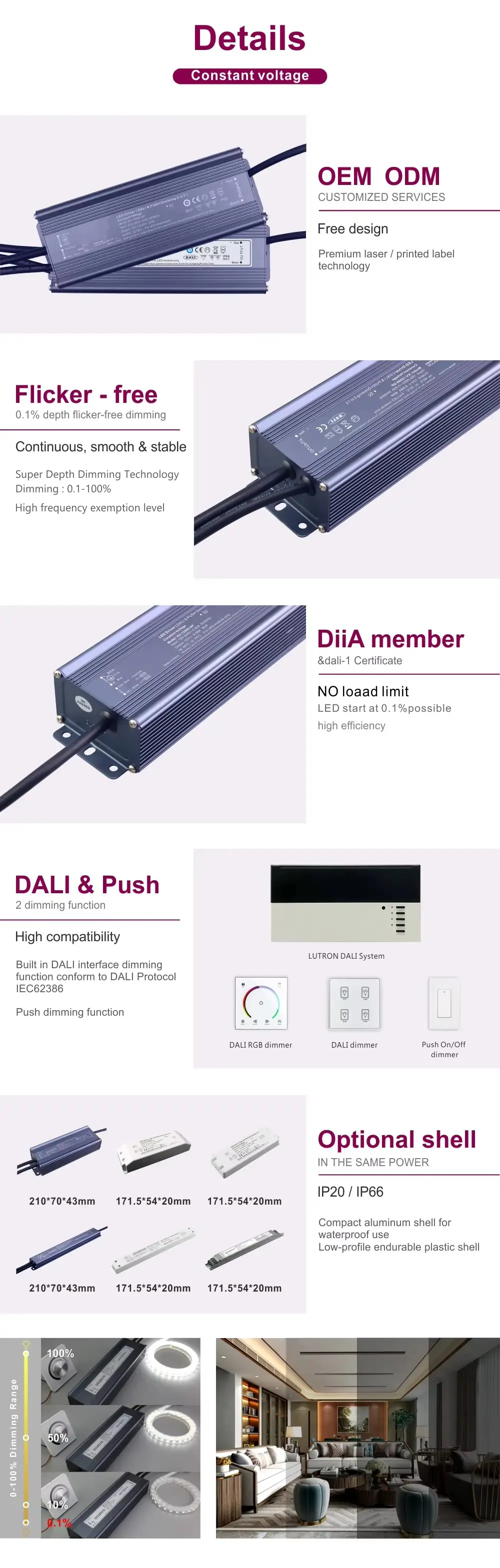 Ngalami stabilitas cahya mutlak kanthi output tanpa kelip-kelip sing dijamin, penting kanggo kantor, toko eceran, lan setelan kesehatan. Entuk nggawe ambiance sing ora ana tandhingane kanthi jarak peredupan ultra-lancar 0,1% nganti 100%, mbisakake transisi lancar saka cahya tugas sing sregep menyang cahya atmosfer sing alus.