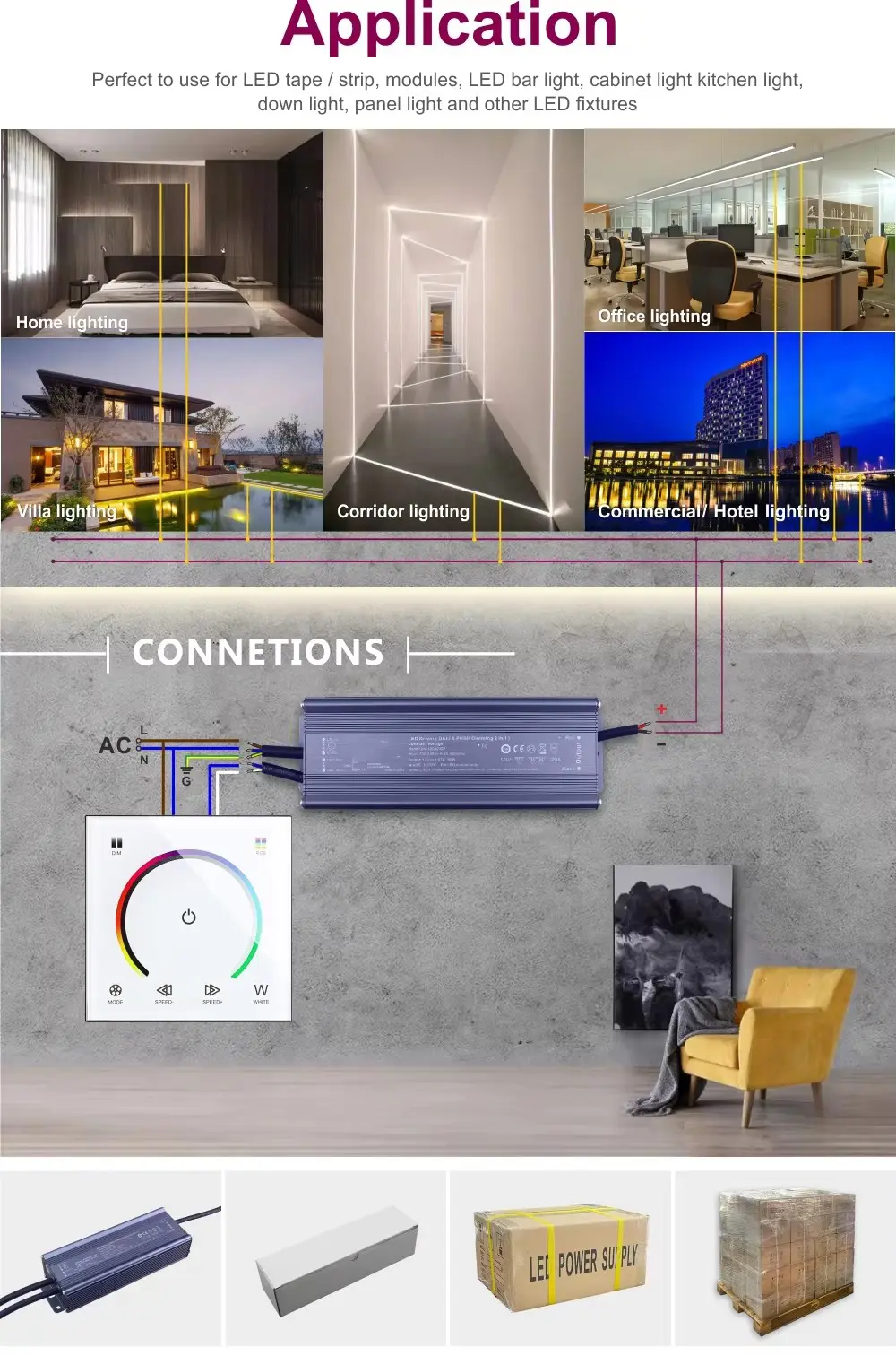 Kasedhiya saka 10W nganti 360W, driver voltase konstan iki bisa dipercaya nguwasani lampu strip LED, modul, lan peralatan linier. Iku pilihan becik kanggo: