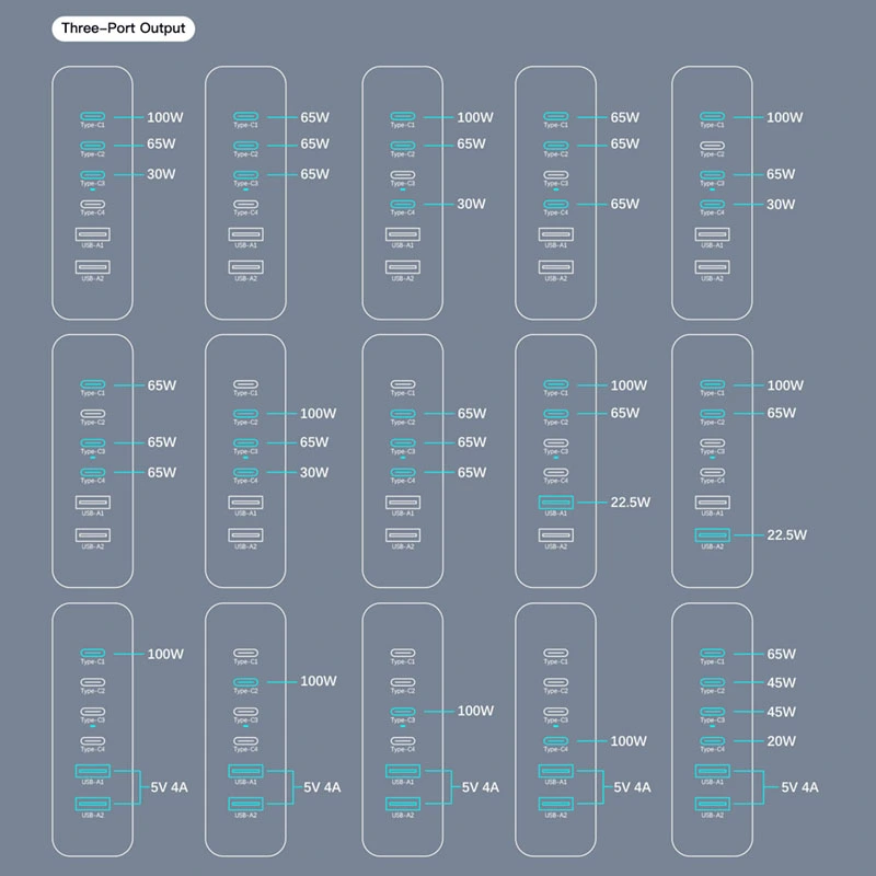 Output USB C1 / C3 / C3 / C4 / C4 / 3A 9V / 3A 12V / 3A 20V / 5A (100W Max / 100W (100W MAX) Output USB C1 / C3 / C3 / C4 / C4 / 3A 9V / 3A 12V / 3A 20V / 5A (100W Max / 100W (100W MAX) |