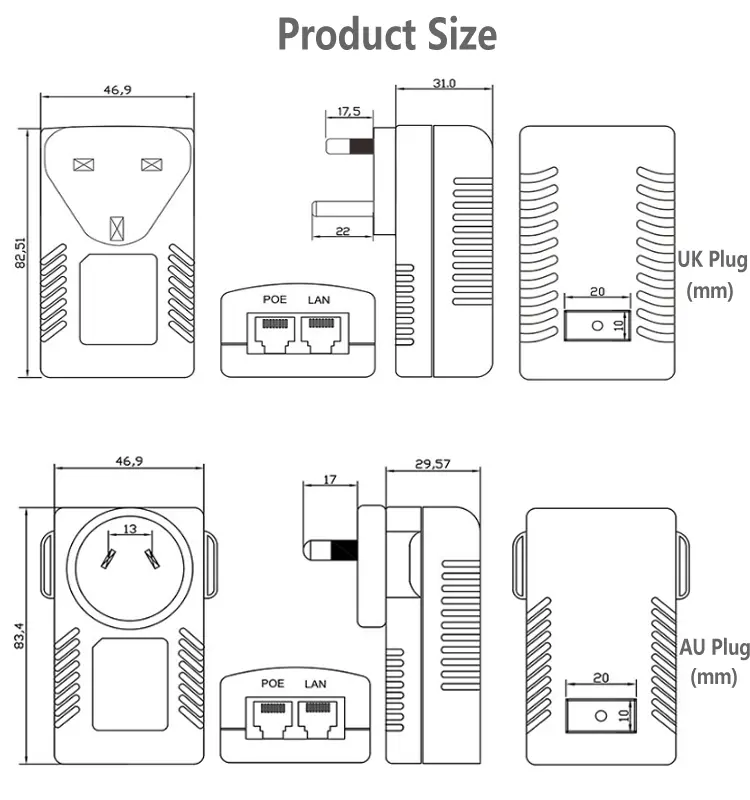 Struktur colokan tembok sing kompak ngidini panggunaan langsung nganggo soket listrik standar, ora mbutuhake braket utawa kabel tambahan. Injector POE 24V 1A 48V 0.5A iki ngirit ruang lan nyederhanakake kabel, dadi pilihan sing cocog kanggo sistem pengawasan omah, kantor, toko lan cilik.