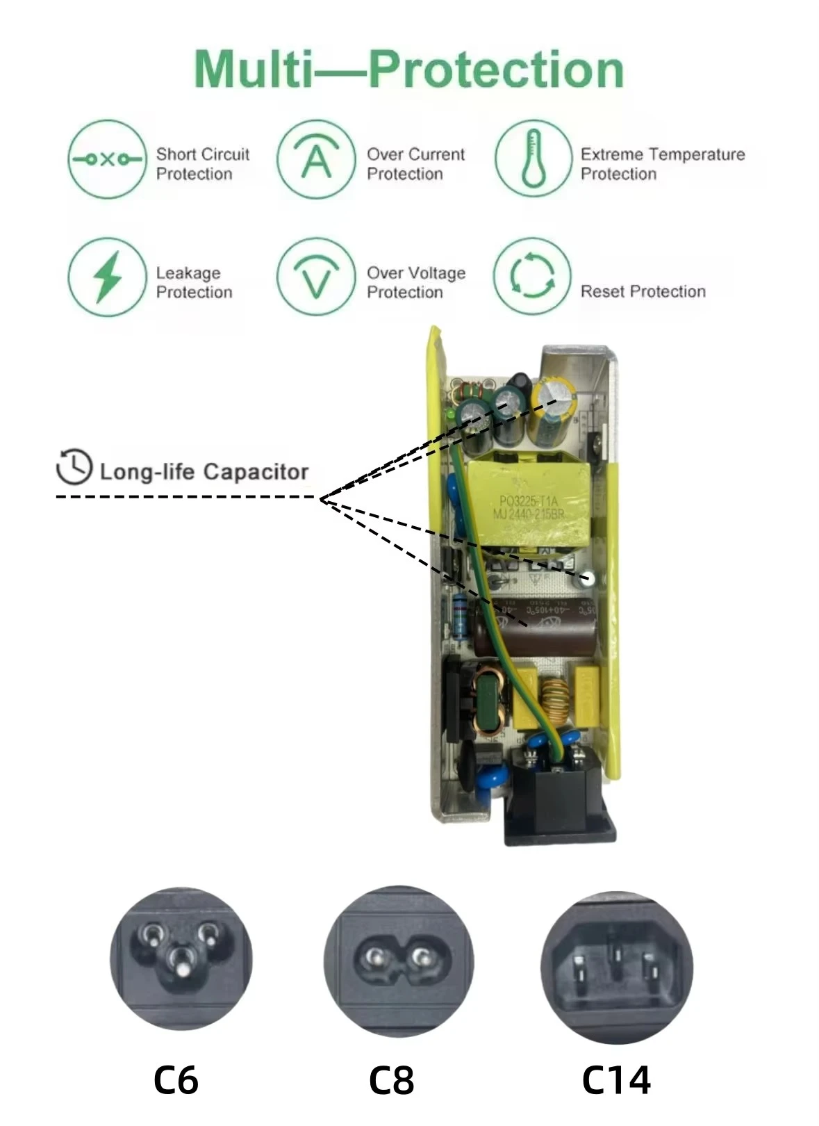 Perlindhungan Keamanan Komprehensif: Perlindhungan terintegrasi kalebu Perlindhungan Over-Current (OCP), Perlindhungan Over-Voltage (OVP), lan Perlindhungan Sirkuit Cekak (SCP) nyegah karusakan ing adaptor lan peralatan sampeyan.