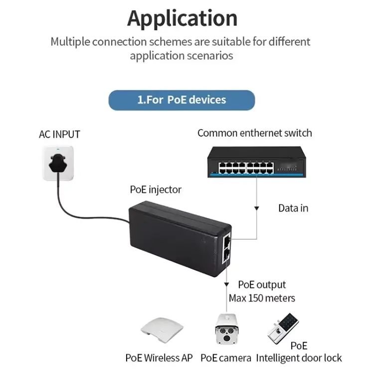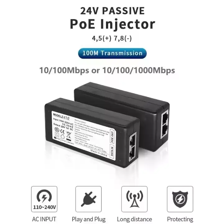 Injector PoE pasif iki nggunakake transmisi daya langsung tanpa jabat tangan protokol, nyuda kerumitan sistem lan ningkatake kompatibilitas karo peralatan jaringan tartamtu.