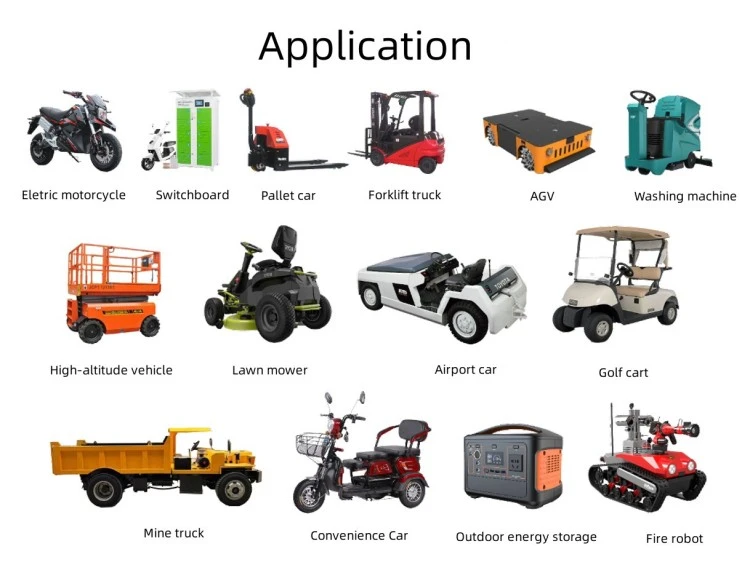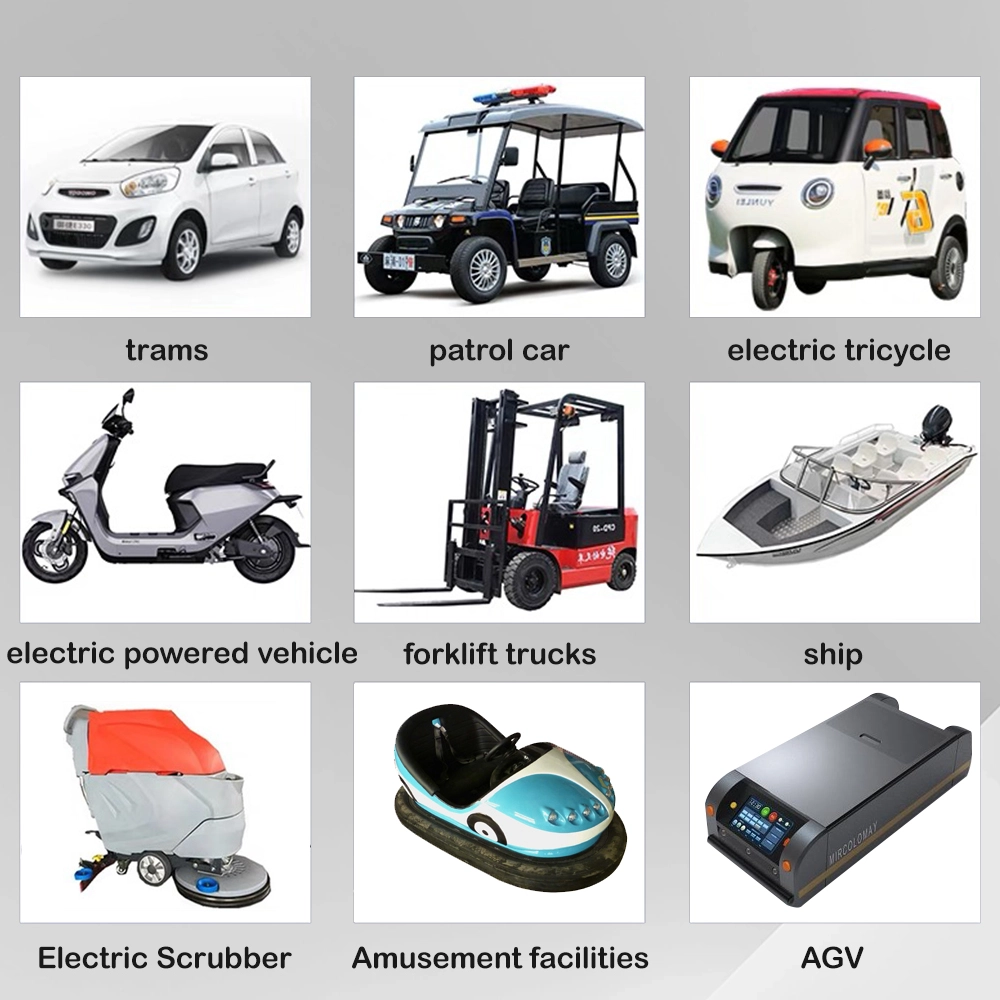 Aplikasi Produk Mobil bemper listrik lan wahana hiburan Kendaraan wisata lan mobil golf Kendaraan patroli lan gerobak keamanan Forklift lan peralatan penanganan material Lantai scrubber lan mesin reresik Kendaraan dipandu otomatis (AGVs) kanggo gudang Kapal listrik, prau, lan prau sarana laut