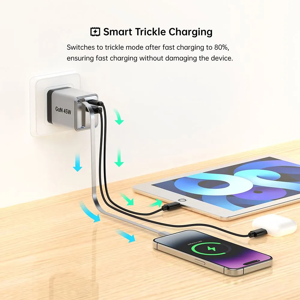 Ngisi daya kacepetan dhuwur: Gan 45W pangisi daya cepet sing bisa ditarik maneh akeh output kuat saka 45 watt, njamin kanthi cepet kanggo piranti.