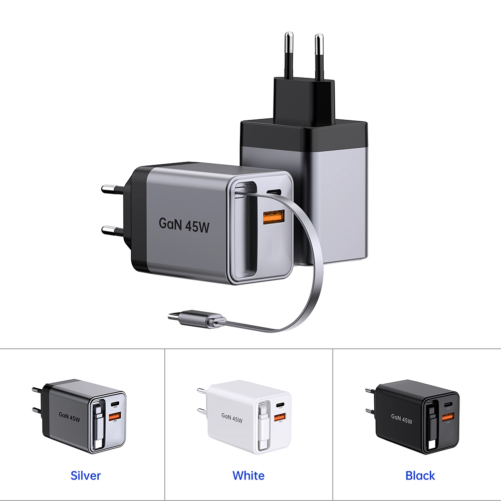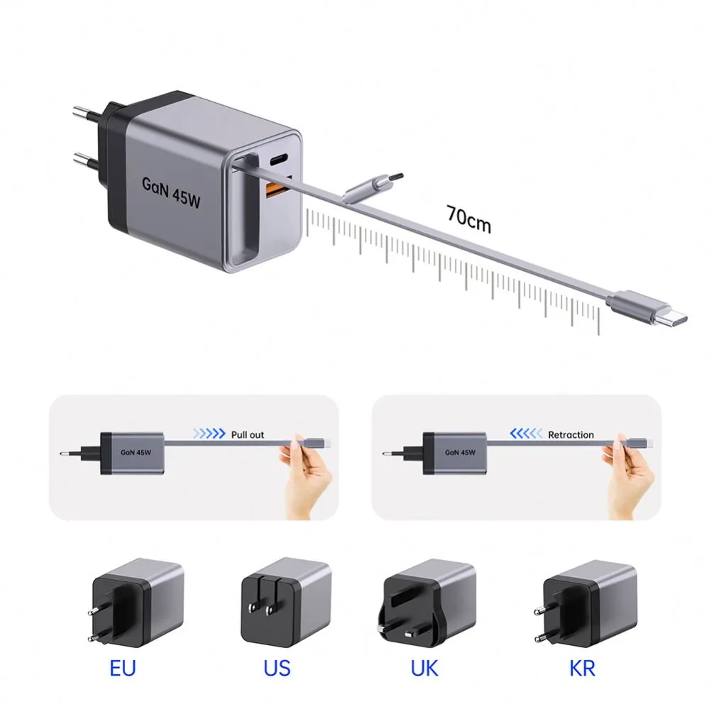 Gan 45W-kabel USB Fast Charger cepet + USB-A + USB-C 45W Charger nganggo kabel