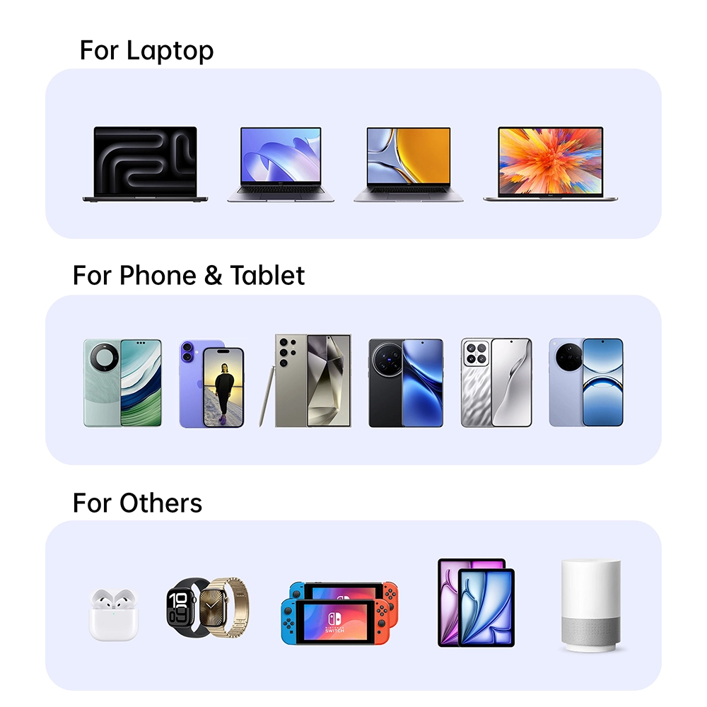 Kompatibilitas universal: Pangisi daya PD dilengkapi teknologi Delivery (PD), sing kompatibel karo macem-macem piranti, kalebu smartphone, tablet, lan uga laptop tartamtu. Iki minangka solusi pangisi daya utama kanggo kabeh gadget sampeyan.