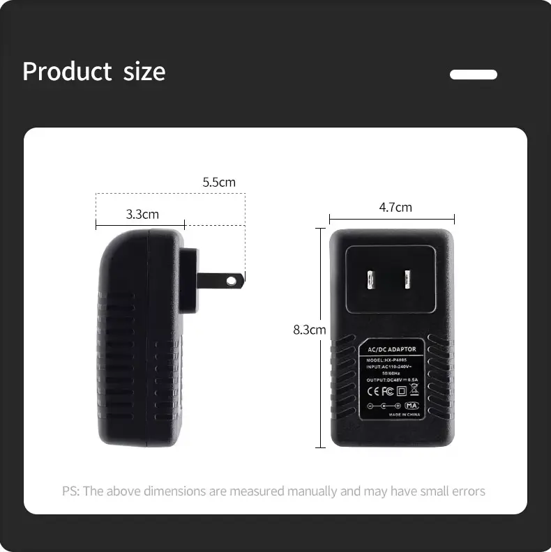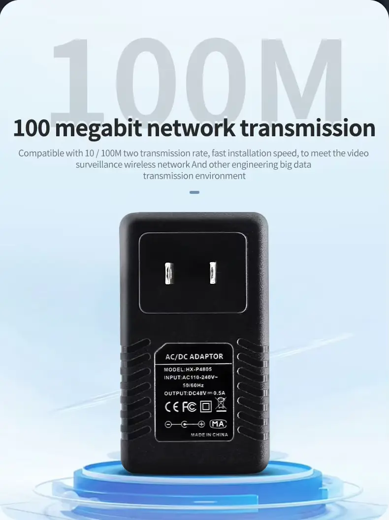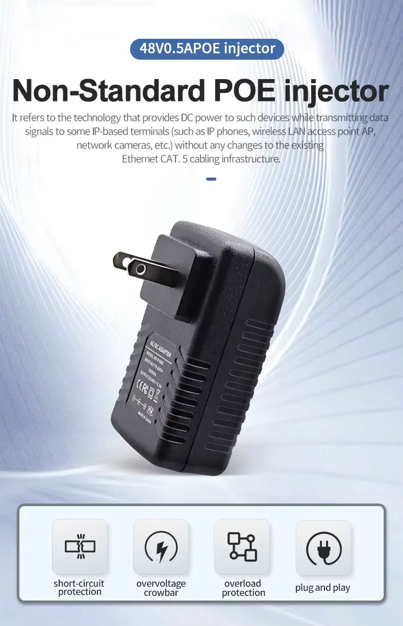 A 48V 0.5A Wall Plug PoE Injector Ethernet Adapter berkualitas tinggi ditawakake pabrikan China Starwell. Unit catu daya iki nyedhiyakake daya output 24W (48V/0.5A), saengga cocok kanggo piranti nirkabel ruangan ruangan-kayata merek kaya Ubiquiti lan MikroTik-uga kamera IP jarak jauh lan jembatan jaringan. Produk kasebut nduweni macem-macem mekanisme proteksi marang overvoltage, overcurrent, lan sirkuit cendhak; iku makaryakke ing sawetara suhu saka -10 ° C kanggo 60 ° C lan nerangake karo babar pisan 5 taun.