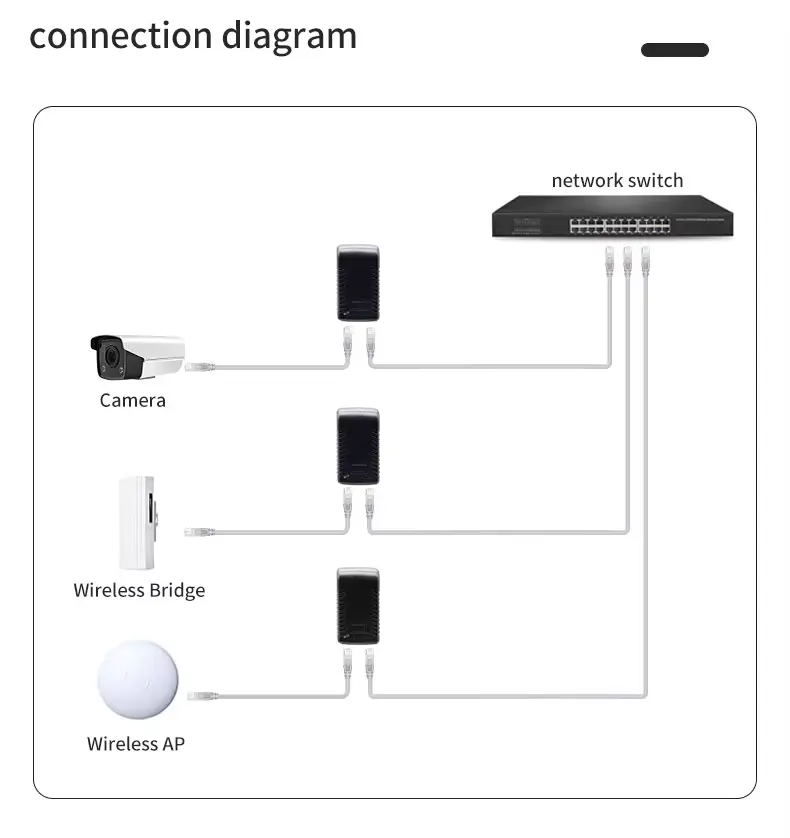 Injector iki dirancang khusus kanggo piranti jaringan sing mbutuhake input DC 48V liwat Ethernet. Kompatibel karo peralatan standar industri, kalebu:
