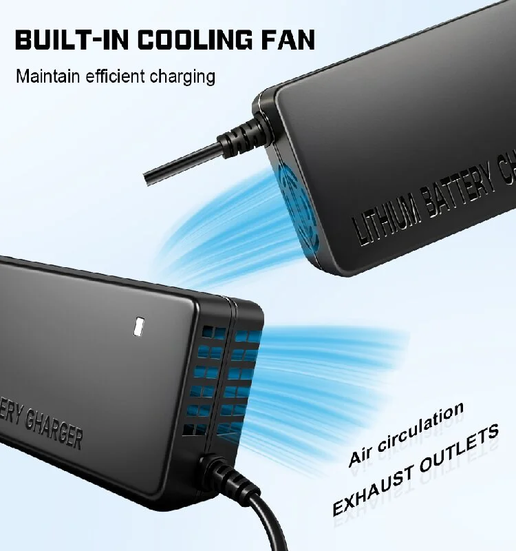 Dilengkapi chip manajemen mikrokomputer sing dibangun, pangisi daya ngawasi voltase baterei lan fluktuasi suhu ing wektu nyata. Makaryakke bebarengan karo Sistem Manajemen Baterei (BMS) kanggo mesthekake yen proses pangisian daya tetep aman lan bisa dikontrol, saengga bisa nyukupi syarat kemasan baterei lithium-ion sing ketat.