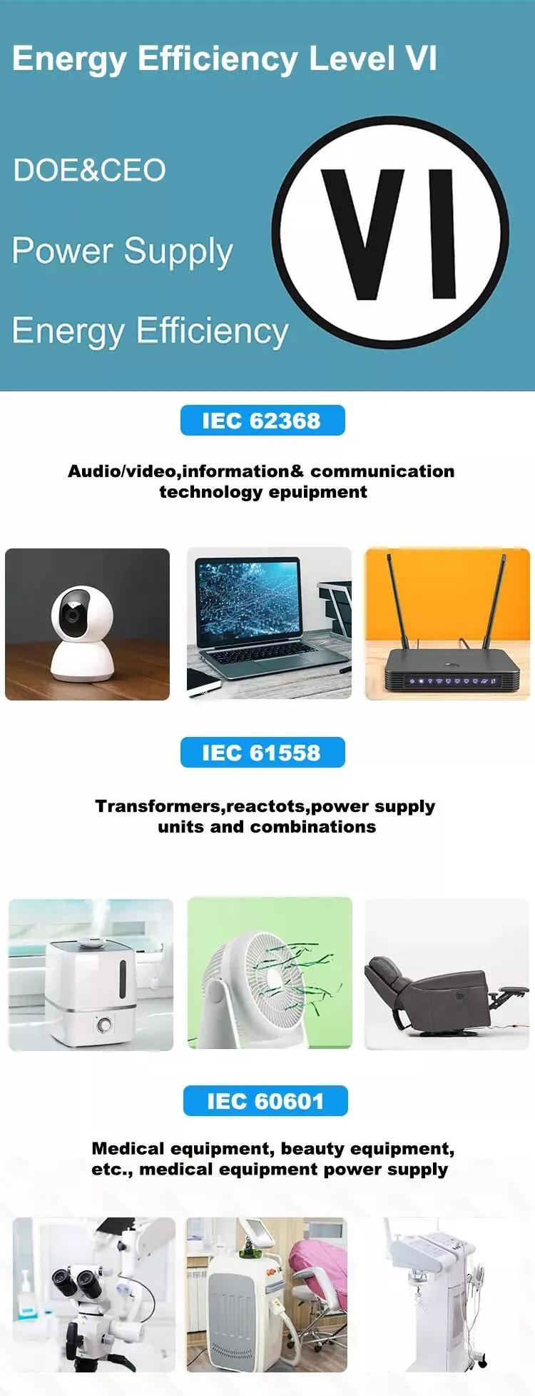 IEC62368 kanggo konsumen elektronik, IEc60335 kanggo pangisi daya baterei, iEc61558 kanggo aplikasi omah, IEc61347 kanggo lampu LED. |