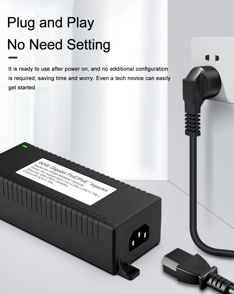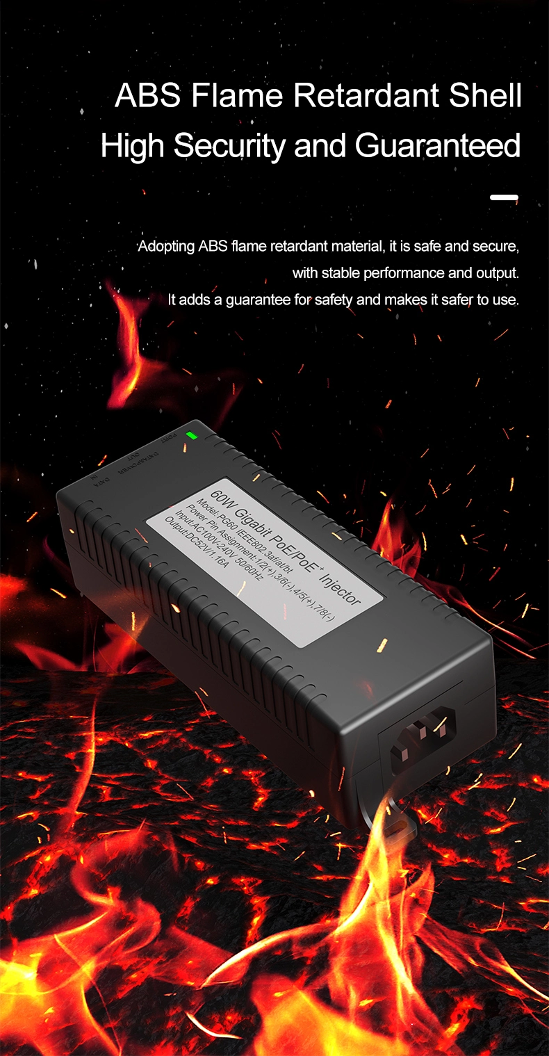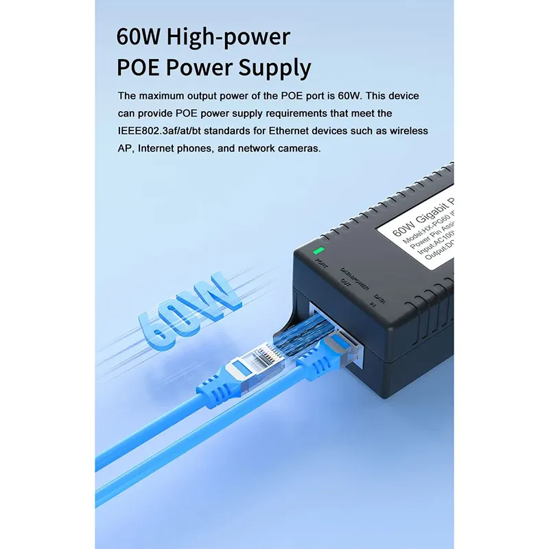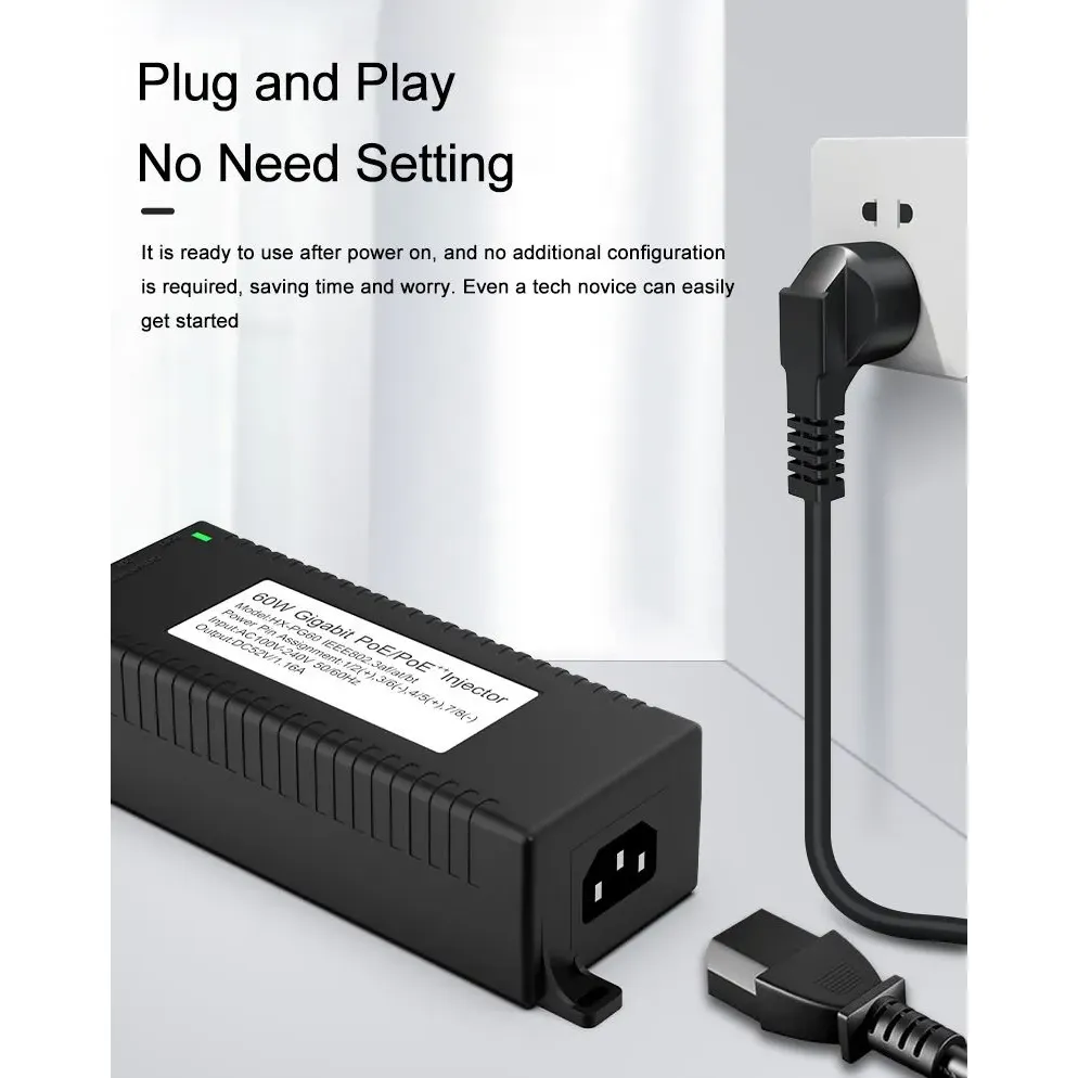 Pengawasan Keamanan: injektor POE desktop Gigabit 60W kanggo Keamanan Kamera IP lan Piranti Jaringan nyedhiyakake daya stabil kanggo kamera IP lan kamera PTZ.