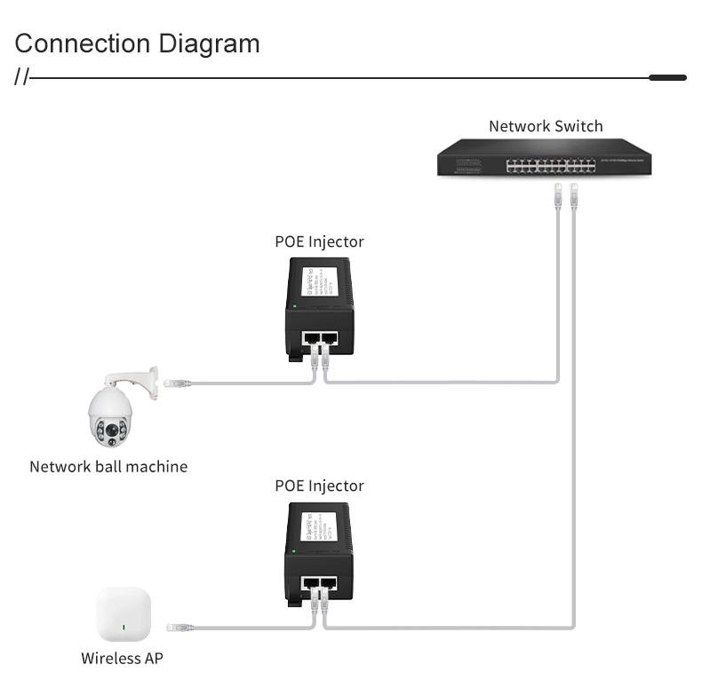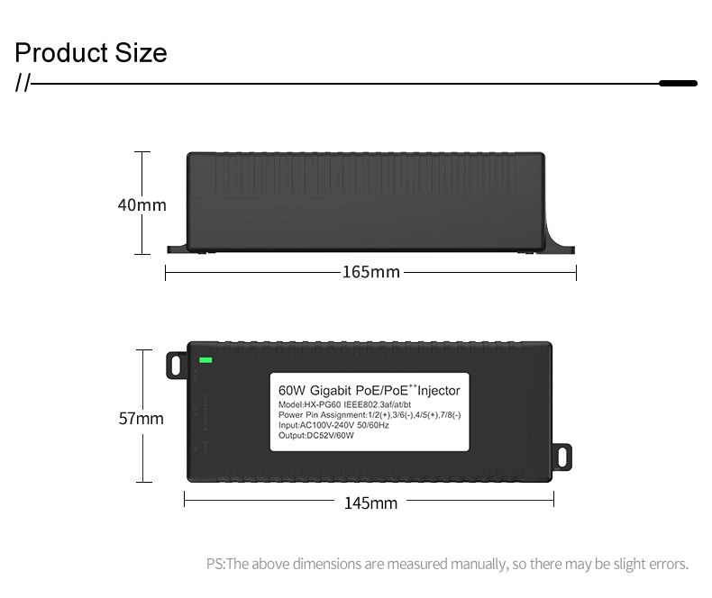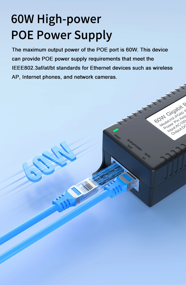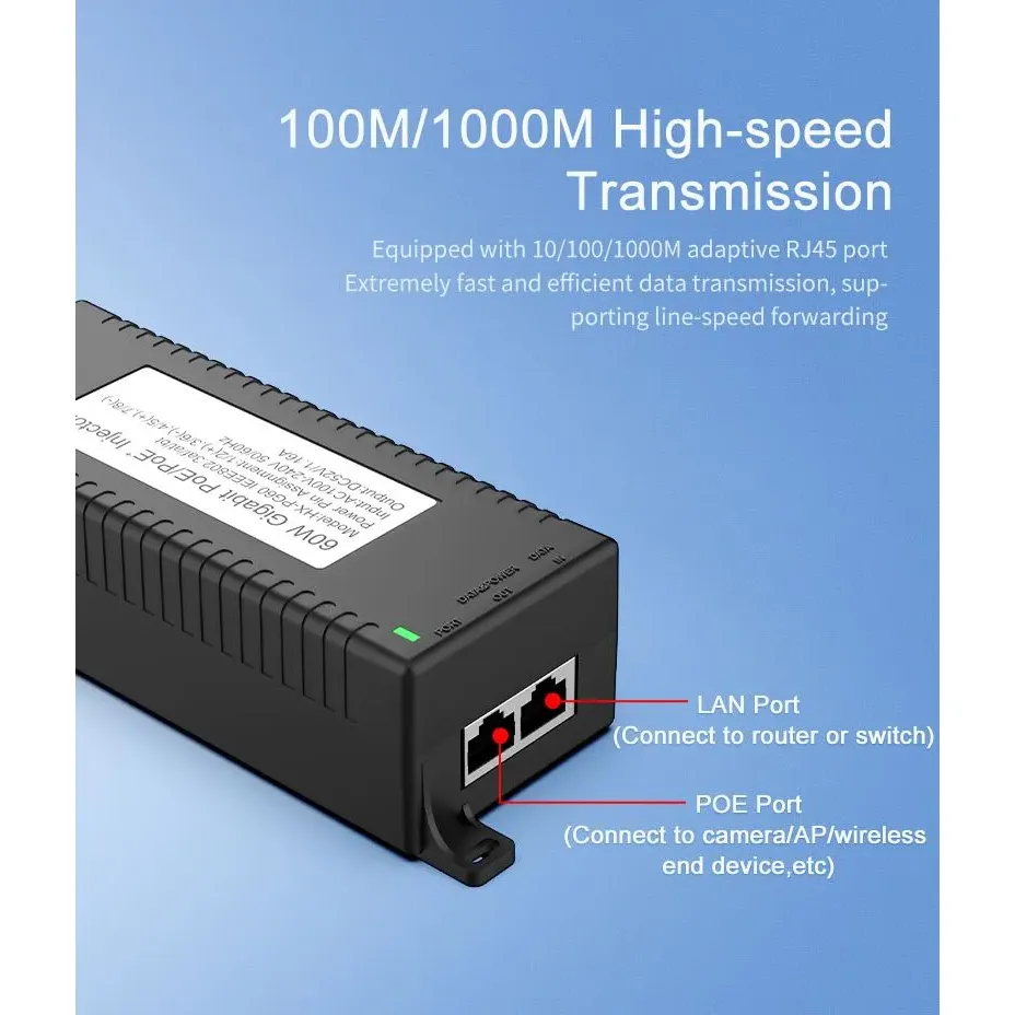 Pengawasan Keamanan: injektor POE desktop Gigabit 60W kanggo Keamanan Kamera IP lan Piranti Jaringan nyedhiyakake daya stabil kanggo kamera IP lan kamera PTZ.