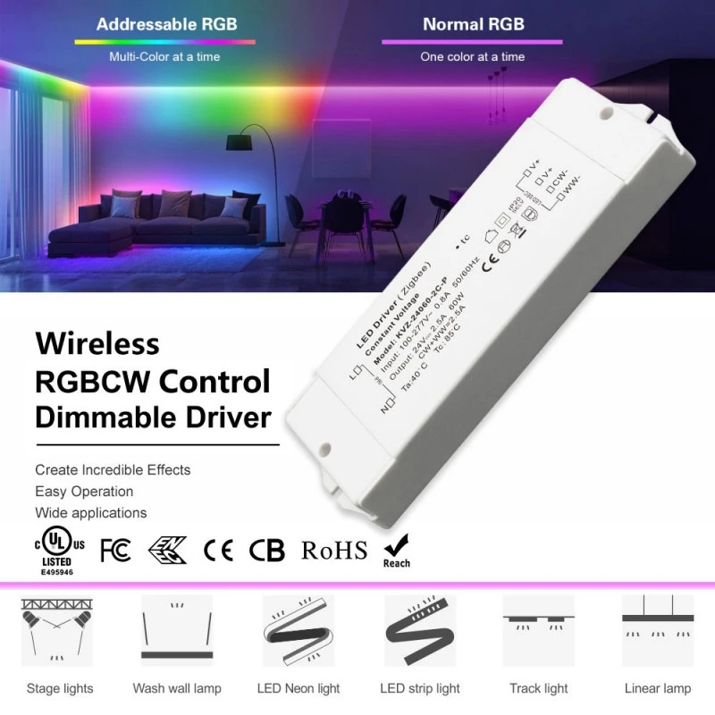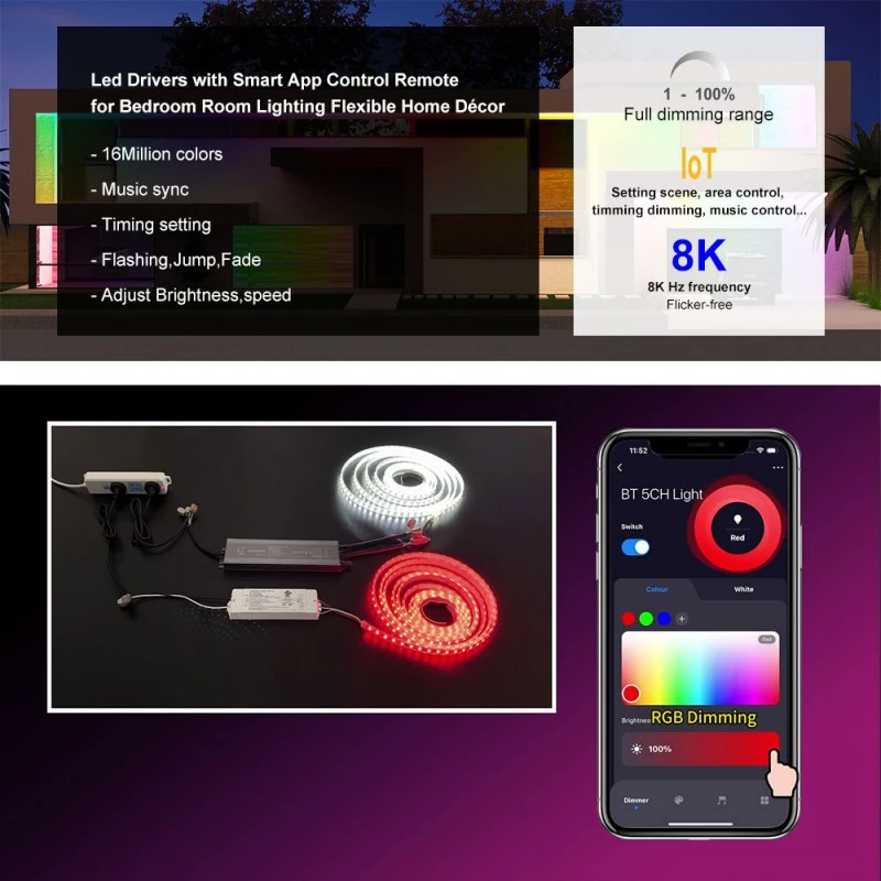 Smart Dimming ing pucuk driji Nampilake modul nirkabel ZigBee terintegrasi kanthi teknologi TUYA, driver iki nawakake kontrol cerdas sing lancar. Setel padhange liwat aplikasi seluler utawa printah swara liwat Google Home lan Amazon Echo. Output PWM 8K Hz frekuensi dhuwur njamin dimming tanpa kedhep, dene kisaran dimming 1-100% kanthi ambane 1% ngidini transisi sing lancar lan nggawe suasana sing sampurna.