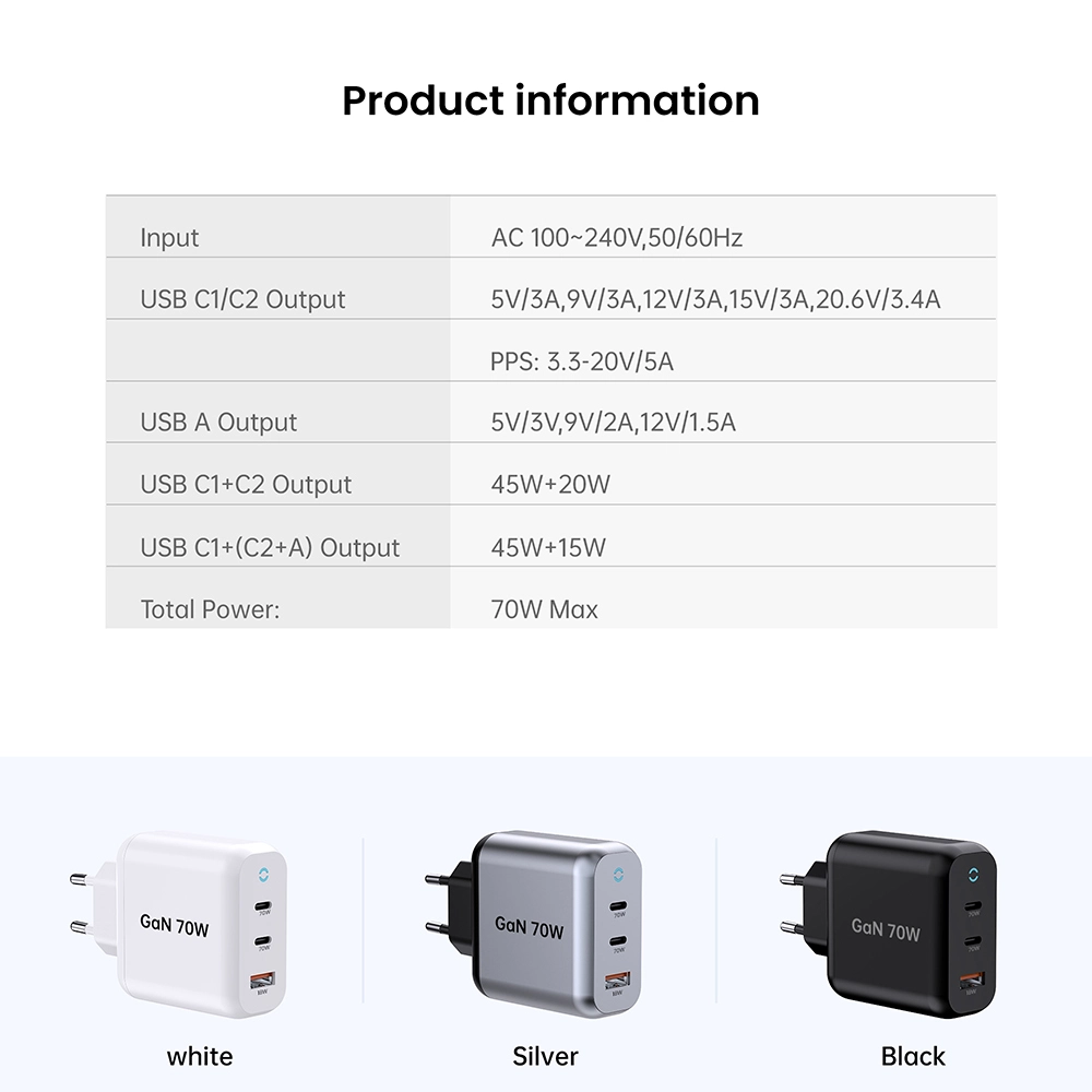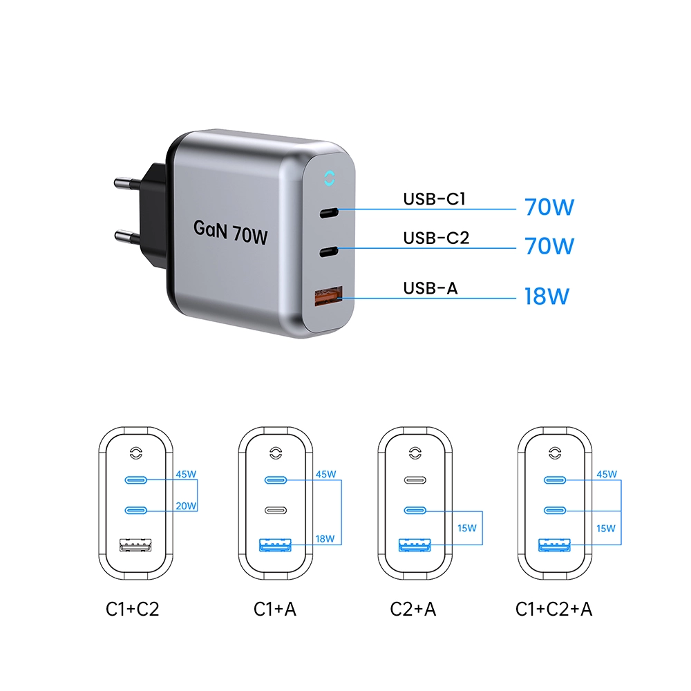 Output C1 / C2: 5V3A, 9V3A, 15V3A, 20.6V3.4A (70W Max) PPS: 3.3-11V 4.05A USB-Output: 5V3A, 9V2A, 12V1.5A 3.3-11V 2A (22W Max) Output C1 + C2: 45w + 20w C1 + C2 + USB-Output: 45w + 5V3A Jumlah: 70w |