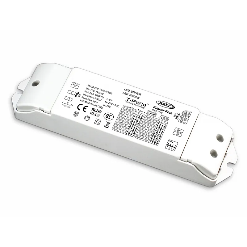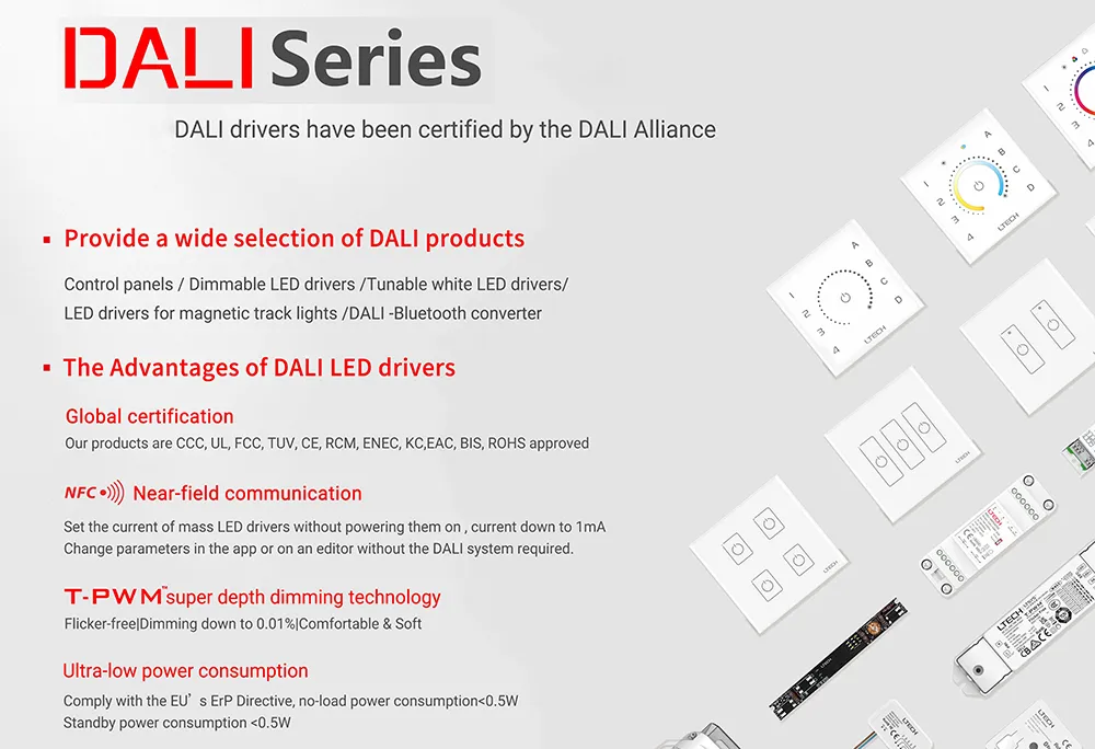 Kontrol Dimming DALI Lanjut - Ngaktifake peredupan digital saka 0,1% nganti 100% kanthi resolusi dhuwur, ndhukung nganti 64 alamat DALI kanggo kontrol individu utawa klompok ing sistem lampu otomatis.