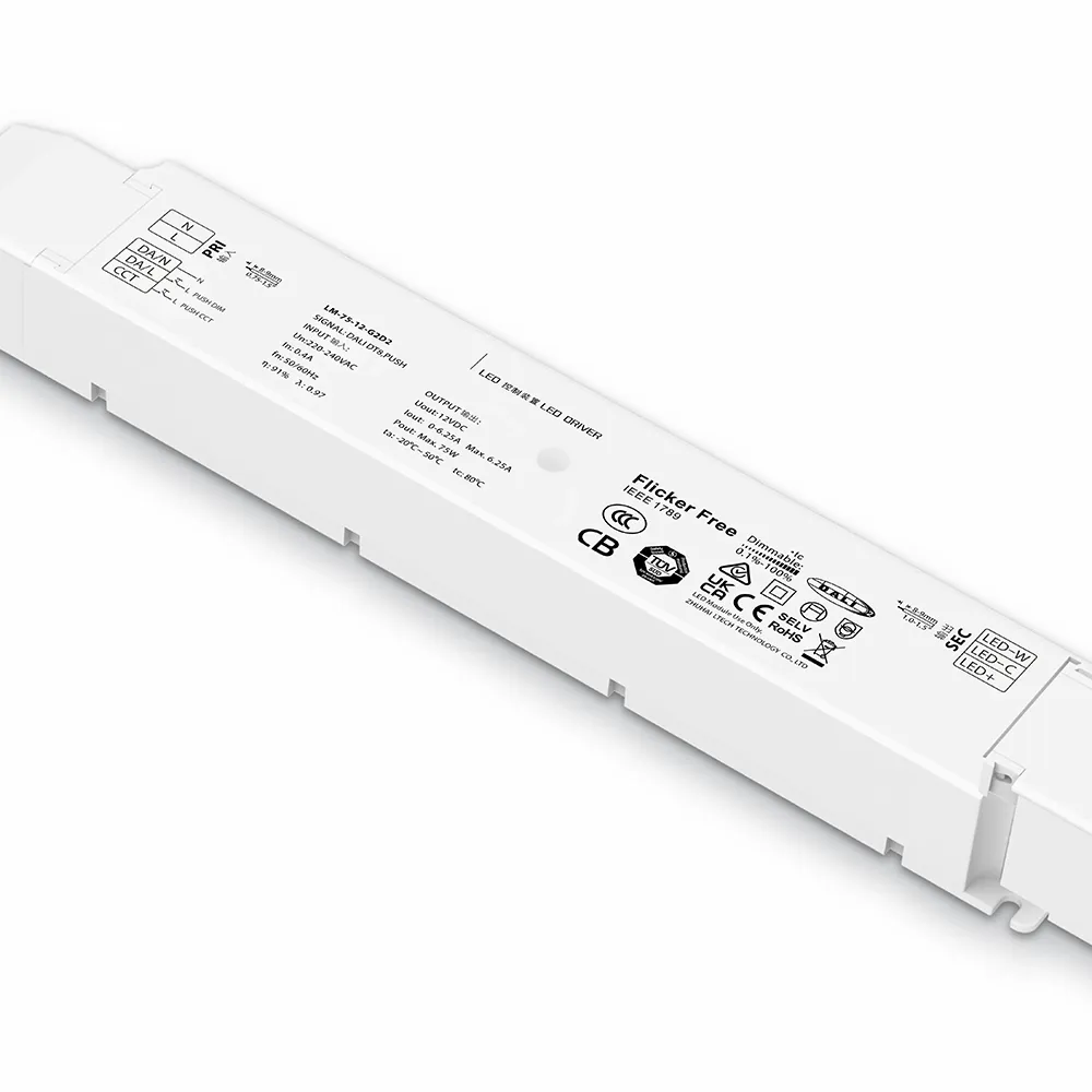 Driver LED DALI iki nduweni output tegangan konstan 12V ± 2%, nyedhiyakake katerangan sing konsisten tanpa kedhep. Iki nampa kisaran voltase input universal 100-240V AC, saengga cocog kanggo panggunaan global. Piranti kasebut beroperasi kanthi efisiensi dhuwur nganti 90%, nyuda sampah energi lan ngasilake panas. Iku kalebu pangayoman lengkap marang sirkuit cendhak, kakehan, overvoltage, lan over-suhu. Kanthi omah logam sing tahan lama lan rating IP65, dilindhungi saka jet bledug lan banyu, njamin kinerja sing dipercaya ing lingkungan njero ruangan lan ruangan (rentang suhu operasi: -20 ° C nganti +50 ° C). Antarmuka DALI ndhukung dimming saka 0,1% nganti 100% tanpa swara swara, ngidini pangaturan cahya sing lancar lan fleksibel.