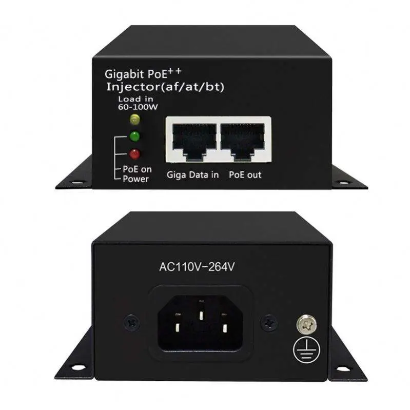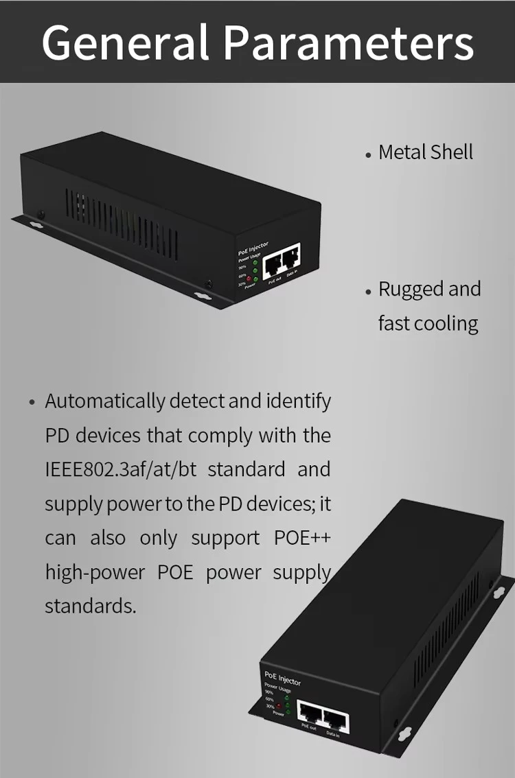 Kualitas tinggi Aktif 60W POE Injector ditawakake pabrikan China Starwell. Iki nduweni siji port input data 10/100/1000Mbps lan siji port output PoE (Data+Daya). Ndhukung kanthi lengkap syarat polaritas alternatif 802.3bt, nggunakake kabeh papat pasangan (1/2+,3/6- & 4/5+,7/8-) kanggo transmisi data simultan lan sumber daya 48V DC.