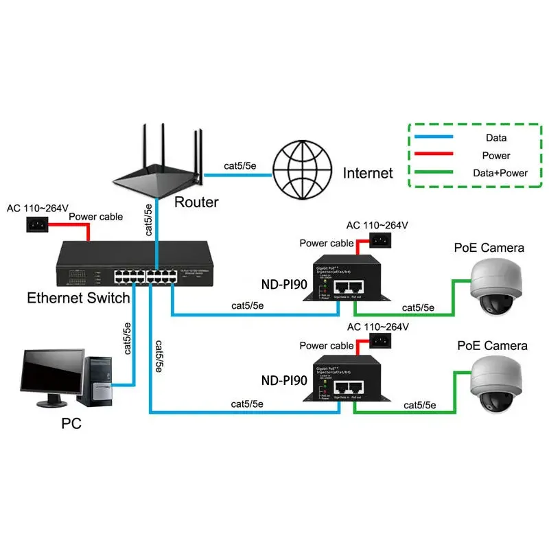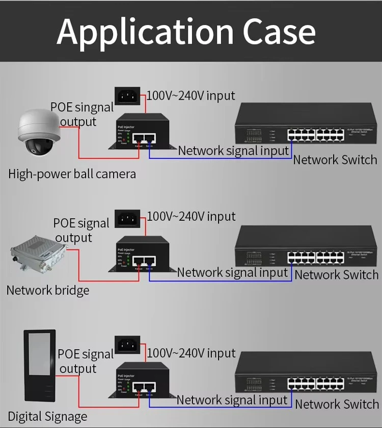 Direkayasa kanggo versatility, injector iki kompatibel karo piranti 802.3af/at. Iku becik kanggo mimpin kamera PTZ, titik akses nirkabel kinerja dhuwur, lan peralatan video conferencing. Produk kasebut nyedhiyakake solusi plug-and-play sing prasaja, ngilangi kebutuhan kanggo stopkontak listrik tambahan lan nyuda kerumitan instalasi ing aplikasi perusahaan lan industri.