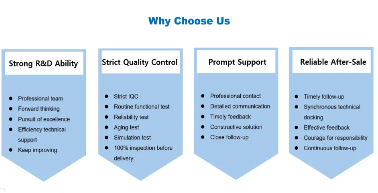 Produk kita kanthi ketat ngrujuk marang standar internasional lan standar industri dhuwur saka desain kanggo proofing kanggo produksi massal, lan tundhuk karo standar internasional kayata CE, FCC, RoHS, ETL etc kanggo mesthekake kompatibilitas lan tundhuk ing pasar global.
