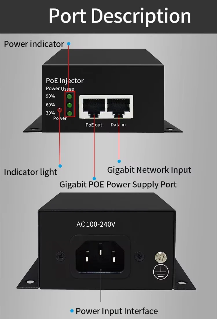 1. 60 W gigabit POE injector: 1 pcs 2. Pandhuan Panganggo:1 pcs 3. Sertifikat .kartu garansi: 1 pcs |