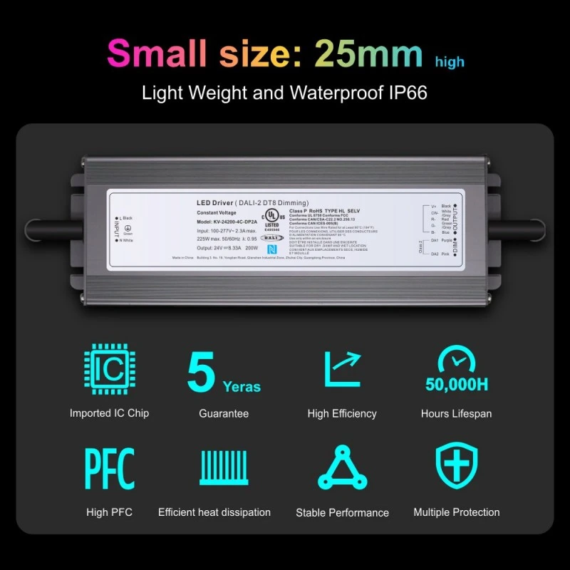 Produk iki minangka DALI Konstan Tegangan 200W CCT Dimmable LED Driver, makili solusi canggih kanggo dhuwur-mburi komersial lan pinter kontrol cahya ngarep. Minangka komponen inti sing tundhuk karo standar DALI 2 DT8 Dimmable 200W LED Driver, ora mung ngidini pangaturan padhang sing lancar lan tanpa langkah, nanging uga, liwat protokol sing ditambahi DT8, nawakake manajemen suhu warna (CCT) lan malah warna (RGB) sing akurat lan digital, nyedhiyakake desainer kanthi kemampuan nggawe cahya dinamis lan bayangan sing durung rampung sadurunge.