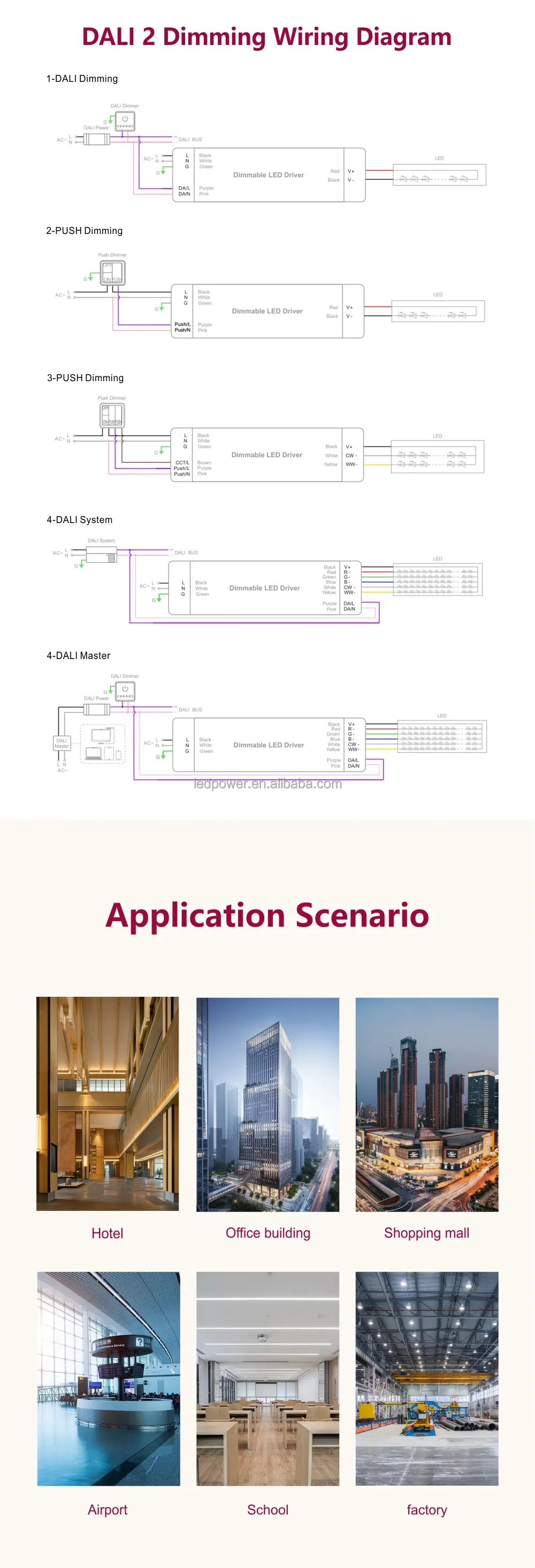 Apa iku prasaja siji-werna suhu dimming utawa Komplek 5 Saluran Rgb Cct pemrograman pemandangan, sumber daya driver iki bisa stably nanggapi kanggo instruksi DALI standar. Iki tegese sampeyan bisa kanthi gampang nggabungake menyang sistem cahya cerdas DALI kanggo entuk kontrol grup, program wektu, lan hubungan sensor. Minangka voltase konstan 12-24 Volt DALI dimmable driver LED dipercaya, kinerja electrical pinunjul njamin sing ngudani lampu LED bisa stably lan irit kanggo dangu.