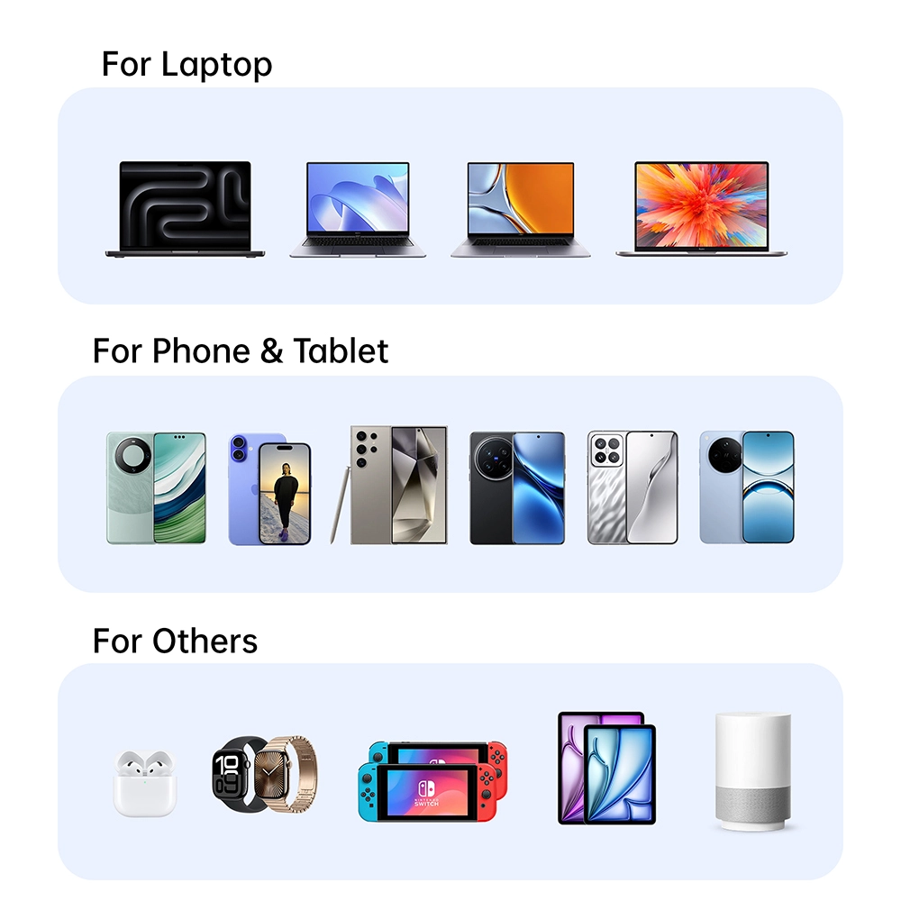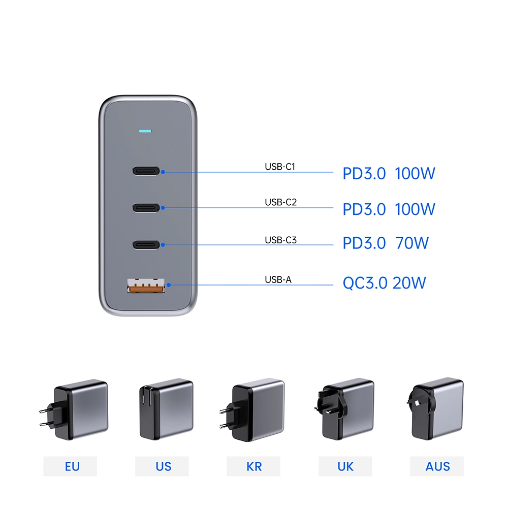 Gan 100W pangisi daya Cende kanggo mbayar pirang-pirang piranti kanthi cepet supaya njaga ruang kerja lan diatur. Gan 100w Fight Charger dilengkapi telung ports USB-C lan siji USB-sawijining port, ngidini kekuwatan nganti papat piranti bebarengan. Apa kanggo nggunakake bisnis utawa omah, bisa ngatasi tugas kanthi gampang. Saka laptop, ponsel, tablet nganti smartwatch, kabeh bisa diisi kanthi lengkap, pungkasane mungkasi era pendhudhuk soket. Iki nyebabake kesederhanaan lan efisiensi dhuwur ing meja sampeyan.