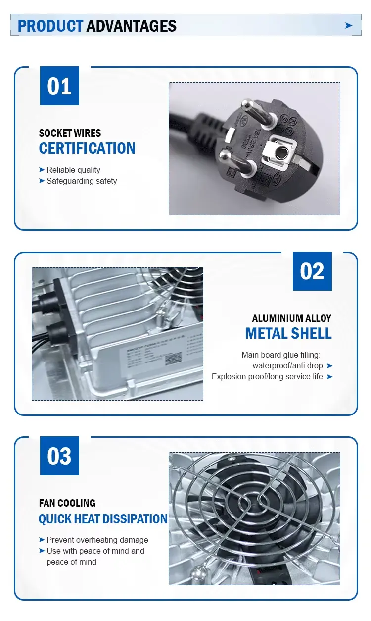 Efisiensi Dhuwur & Perlindhungan Cerdas: Efisiensi nganti 93% lan faktor daya ≥0.98, pangisi daya iki nyuda mundhut energi lan nyuda biaya operasi. Proteksi sing dibangun kalebu overvoltage, short-circuit, polaritas mbalikke, lan proteksi suhu sing luwih dhuwur. Indikator LED nyedhiyakake status pangisian daya kanthi cepet.