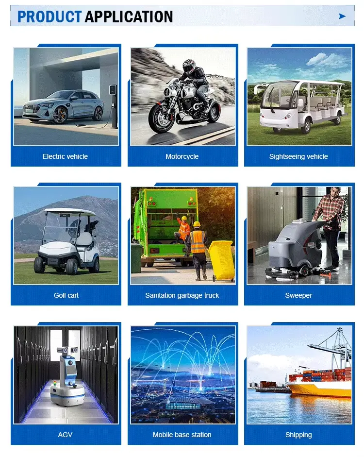Dianggo: Motor / Skuter, Tricycle, Cropper, Sweeper, Forklift, Truk, Bus Listrik, Timbal-asam Baterei, Kendaraan listrik, Kendaraan Sightseeing, Kendaraan Logistik, Kendaraan Reresik, Mobil Patroli, Buggies Dune, Kapal, Peralatan Komunikasi