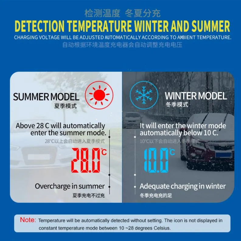 · Mode Pangopènan Otomatis: Fungsi minangka pangisi daya trickle lan pangopènan baterei jangka panjang, becik kanggo kendaraan musiman utawa sing jarang digunakake.