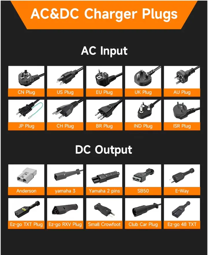 Plug EU, biasane kanggo negara EU kayata Jerman, Prancis, Walanda, Denmark, Austria, Swedia, lsp. Plug UK, biasane kanggo Inggris, India, Pakistan, Singapura lan liya-liyane. Plug AU, biasane kanggo Australia, Selandia Baru, Argentina lan liya-liyane. Konektor DC umum ing pasar kalebu Anderson, EZ-go, DS Club Car lan Konektor Yamaha, lsp.