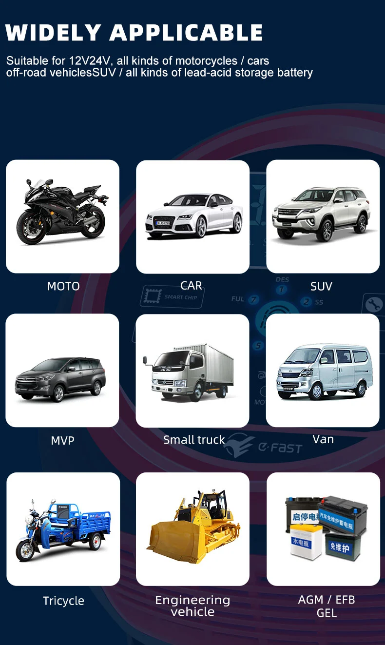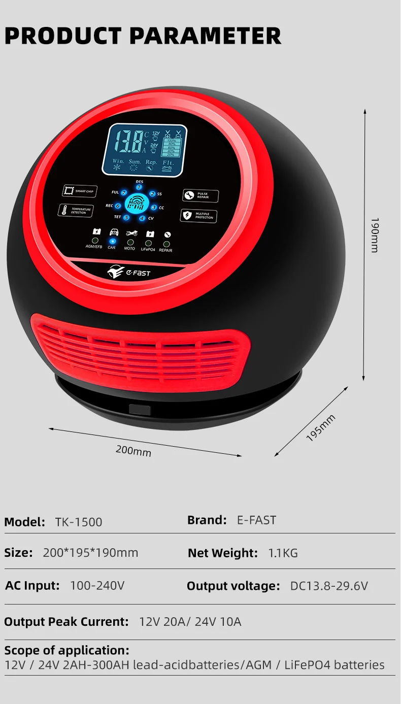 TK-1500 minangka pangisi daya baterei otomatis sing kuat, nawakake rong mode pangisi daya: 12V/20A lan 24V/10A. Iki dirancang khusus kanggo mobil, truk, motor, prau, mesin pemotong rumput, SUV, RV, traktor, lan kabeh jinis skuter. Apa baterei timbal-asam tradisional (banjir, AGM, gel, siklus jero, baterei kalsium), utawa lithium wesi fosfat (LiFePO4) lan baterei lithium-ion, TK-1500 bisa kanthi cerdas ngenali lan cocog karo kurva pangisian daya sing paling apik, kanthi bener entuk fungsi multi-tujuan ing piranti siji.
