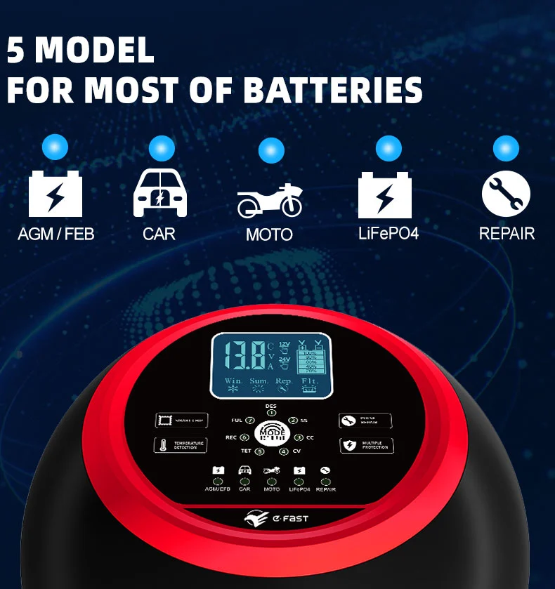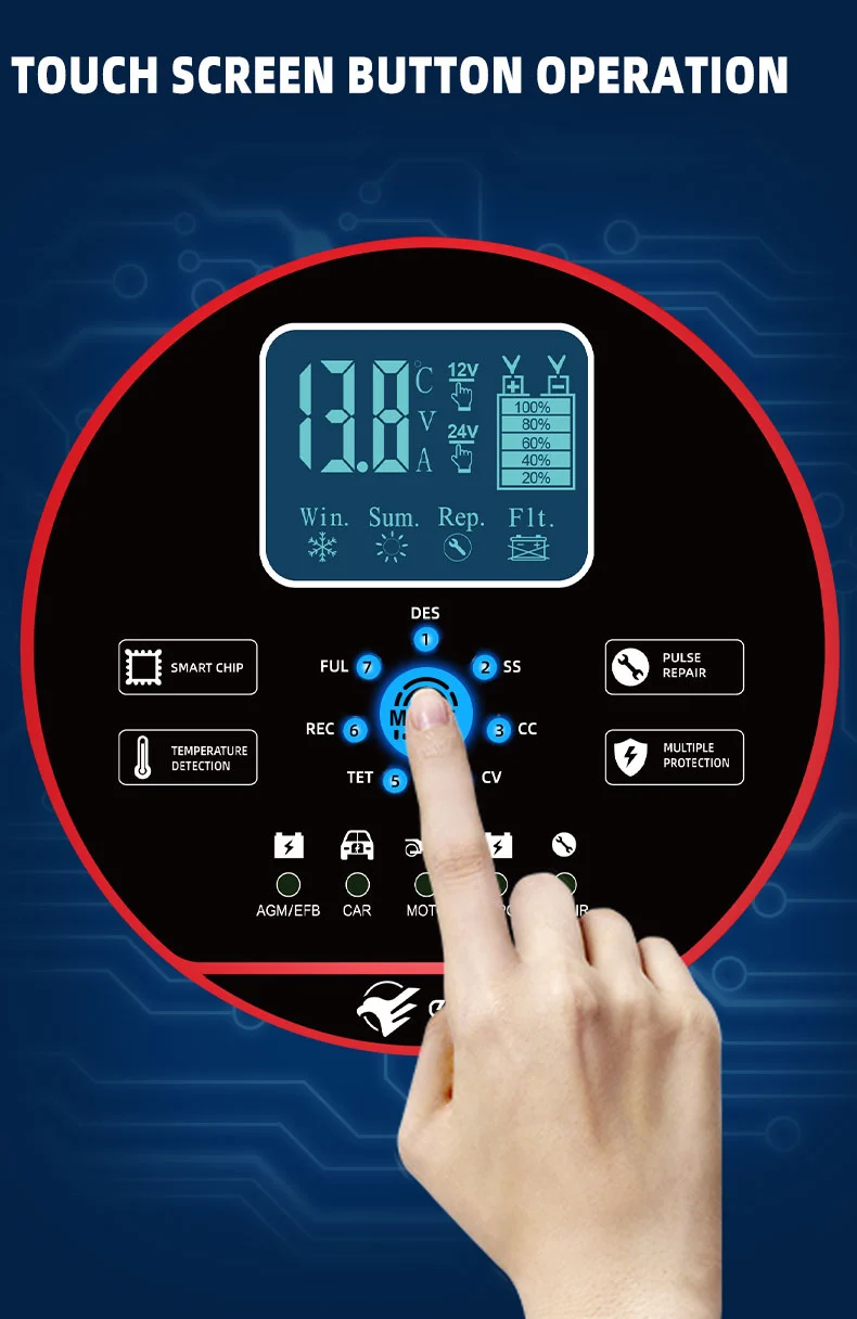 Pangisi daya iki nduweni desain kompak sing inovatif lan dilengkapi tampilan LCD definisi dhuwur sing nuduhake voltase, arus, suhu, proses pangisian daya lan status baterei ing wektu nyata, nggawe operasi kanthi cepet. Nduwe fungsi ndandani pulsa sing bisa ngaktifake lan ndandani baterei sing wis tuwa, ndawakake umure. Minangka pangisi daya cerdas kanthi otomatis, TK-1500 ndhukung operasi "plug lan lali": kanthi otomatis ndeteksi voltase baterei, milih mode pangisian daya, lan ngalih menyang mode pangopènan ngisi daya ngambang sawise ngisi daya lengkap kanggo nyegah overcharging. Iku becik kanggo pangopènan baterei kendaraan sing diparkir kanggo dangu utawa peralatan mangsan kayata mowers lawn lan prau.