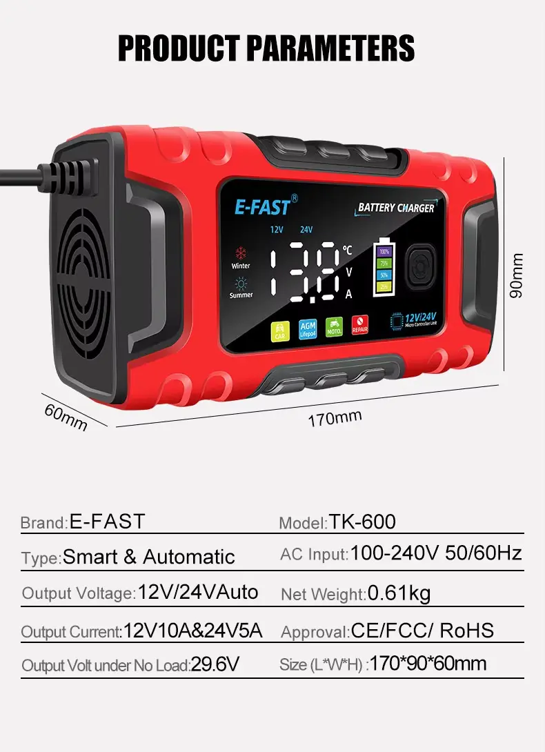 Kualitas Tinggi E-Fast TK-600 kanthi otomatis kanthi Teknologi Perbaikan Pulsa 12V10A 24V5A pangisi daya baterei lifepo4 asam timbal kanggo mobil |